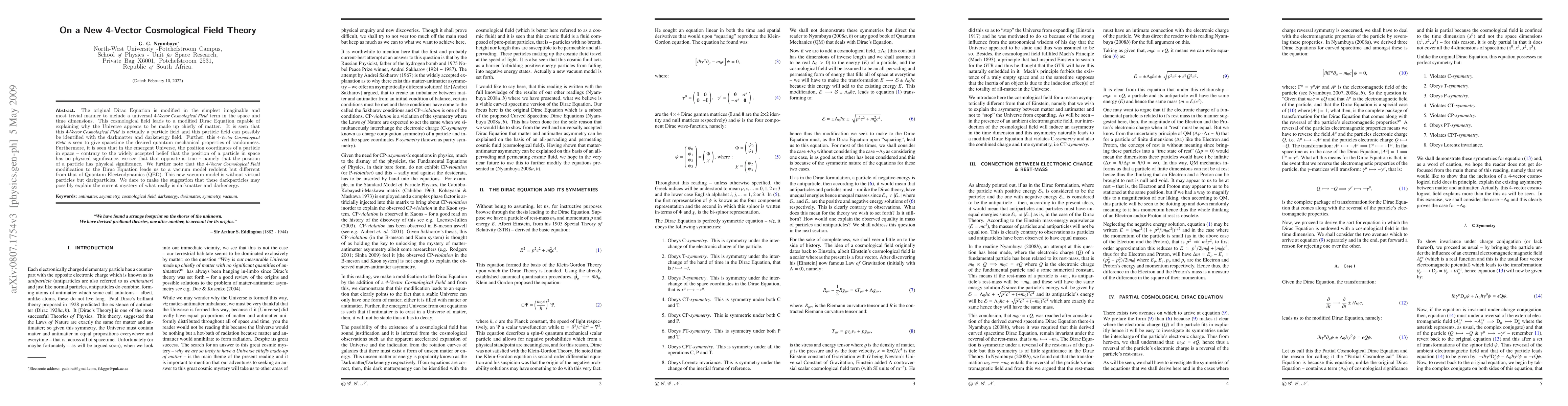 The original Dirac Equation is modified in the simplest imaginable and most trivial manner to include a universal 4-Vector Cosmological Field term in the space and time dimensions. This cosmological field leads to a modified Dirac Equation capable of explaining why the Universe appears to be made up chiefly of matter. It is seen that this 4-Vector Cosmological Field is actually a particle field and this particle field can possibly be identified with the darkmatter and darkenergy field. Further, this 4-Vector Cosmological Field is seen to give spacetime the desired quantum mechanical properties of randomness. Furthermore, it is seen that in the emergent Universe, the position coordinates of a particle in space -- contrary to the widely accepted belief that the position of a particle in space has no physical significance, we see that that opposite is true - namely that the position of a particle has physical significance. We further note that the 4-Vector Cosmological Field modification to the Dirac Equation leads us to a vacuum model redolent but different from that of Quantum Electrodynamics (QED). This new vacuum model is without virtual particles but darkparticles. We dare to make the suggestion that these darkparticles may possibly explain the current mystery of what really is darkmatter and darkenergy.