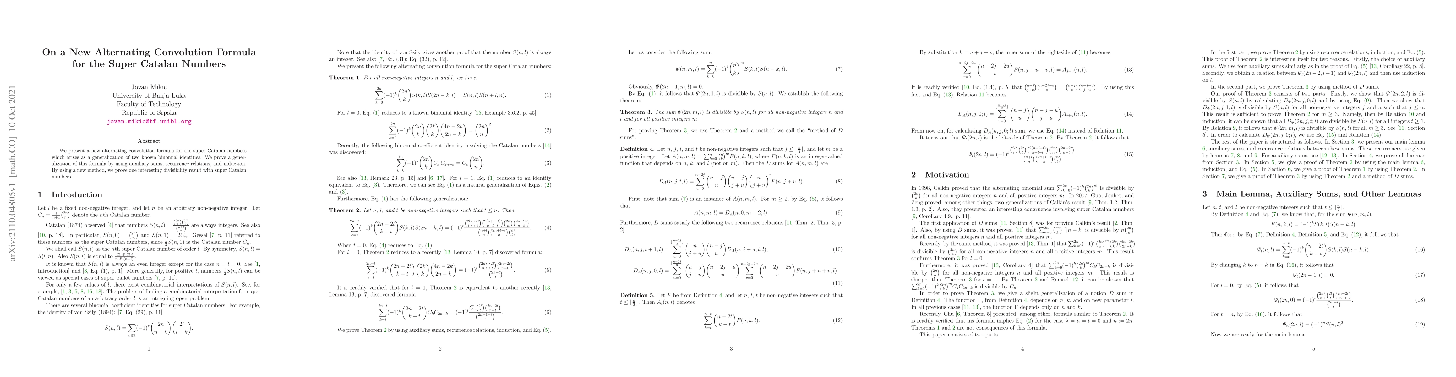 This paper introduces a novel alternating convolution formula for super Catalan numbers, generalizing existing binomial identities, and proves it through auxiliary sums, recurrence relations, and induction. Additionally, it establishes a significant divisibility result related to these numbers.