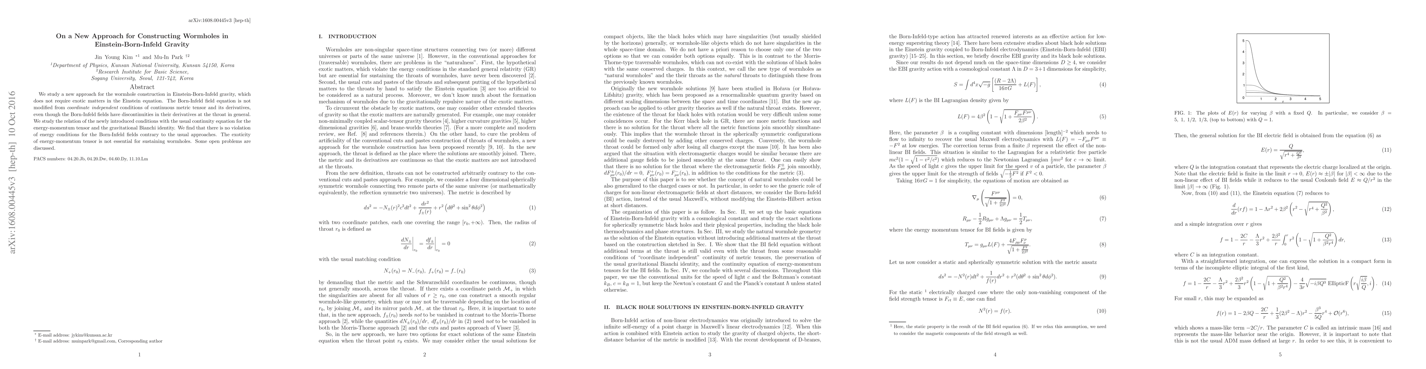 We study a new approach for the wormhole construction in Einstein-Born-Infeld gravity, which does not require exotic matters in the Einstein equation. The Born-Infeld field equation is not modified from "coordinate independent" conditions of continuous metric tensor and its derivatives, even though the Born-Infeld fields have discontinuities in their derivatives at the throat in general. We study the relation of the newly introduced conditions with the usual continuity equation for the energy-momentum tensor and the gravitational Bianchi identity. We find that there is no violation of energy conditions for the Born-Infeld fields contrary to the usual approaches. The exoticity of energy-momentum tensor is not essential for sustaining wormholes. Some open problems are discussed.