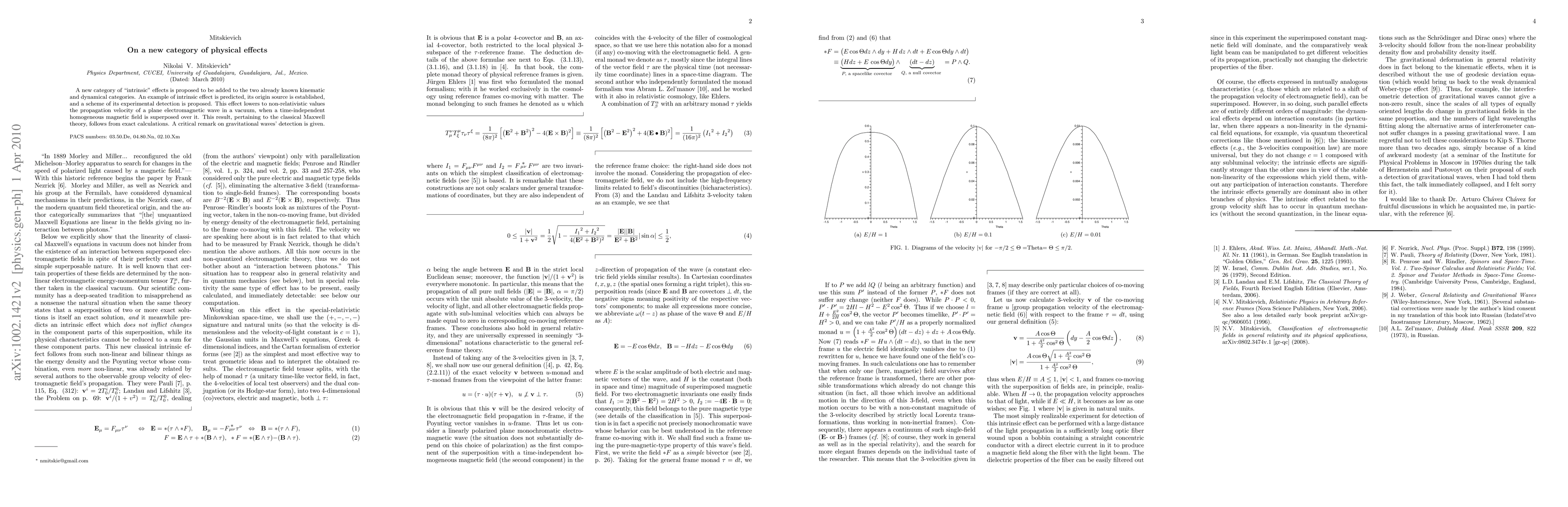 A new category of "intrinsic" effects is proposed to be added to the two already known kinematic and dynamical categories. An example of intrinsic effect is predicted, its origin source is established, and a scheme of its experimental detection is proposed. This effect lowers to non-relativistic values the propagation velocity of a plane electromagnetic wave in a vacuum, when a time-independent homogeneous magnetic field is superposed over it. This result, pertaining to the classical Maxwell theory, follows from exact calculations. A critical remark on gravitational waves' detection is given.