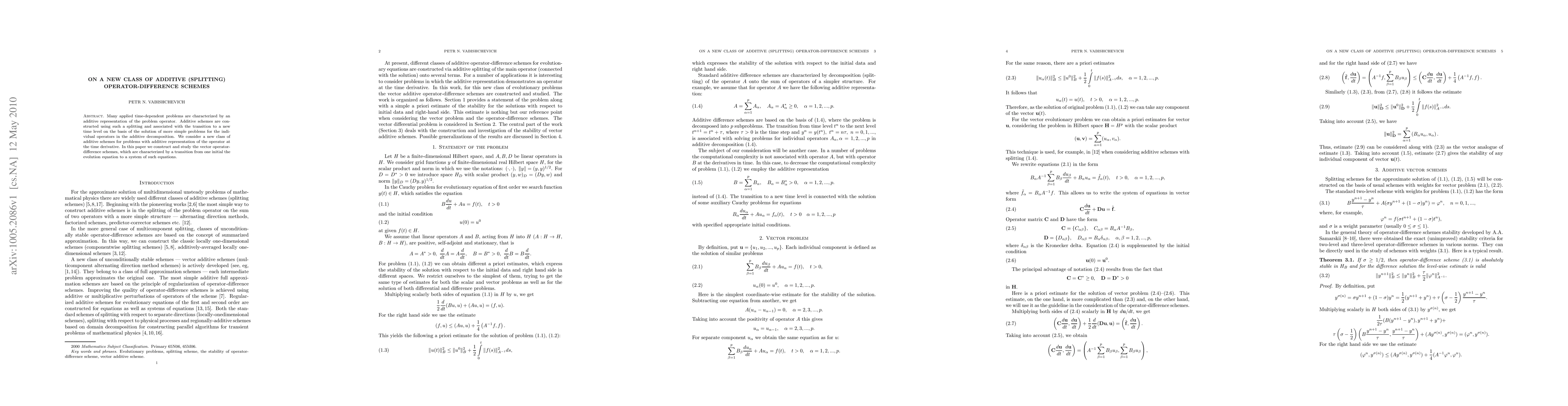 This paper introduces a new class of additive operator-difference schemes for time-dependent problems with additive operator representations. The proposed vector operator-difference schemes transition from a single initial evolution equation to a system of simpler, solvable equations.