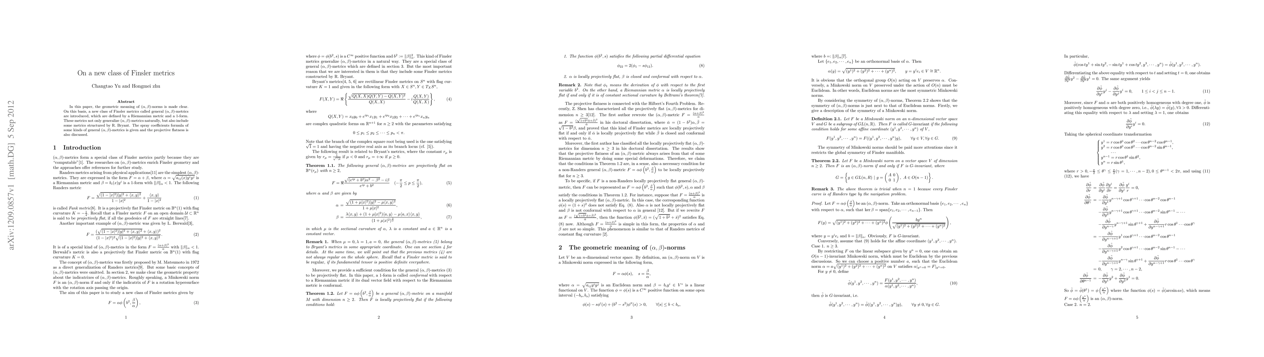 In this paper, the geometric meaning of (alpha,beta)-norms is made clear. On this basis, we introduce a new class of Finsler metrics called general (alpha,beta)-metrics, which are defined by a Riemannian metric and an 1-form. These metrics not only generalize original (alpha,beta)-metrics naturally, but also include some metrics structured by R. Bryant. The notion of general (alpha,beta)-metrics is one of the original ideas belongs to the first author(another one is beta-deformations intruduced in the paper "Deformations and Hilbert's Fourth Problem"). We believe that the researches on general (alpha,beta)-metrics will enrich Finsler geometry and the approaches offer references for further study. But it seems that the classical methods suitable for (alpha,beta)-metrics may not be suitable for them, the idea used in this paper, which is closely related to beta-deformations, is non-classical. Any communication or suggestion is welcome.