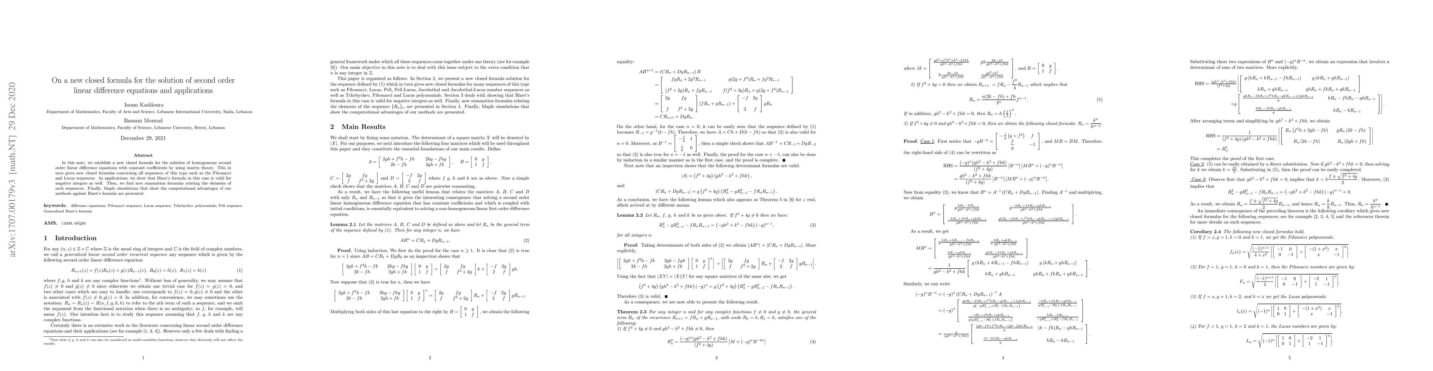 This paper introduces a novel closed formula for solving homogeneous second-order linear difference equations using matrix theory, extending its application to sequences like Fibonacci and Lucas. It also validates Binet's formula for negative integers and derives new summation formulas for these sequences.