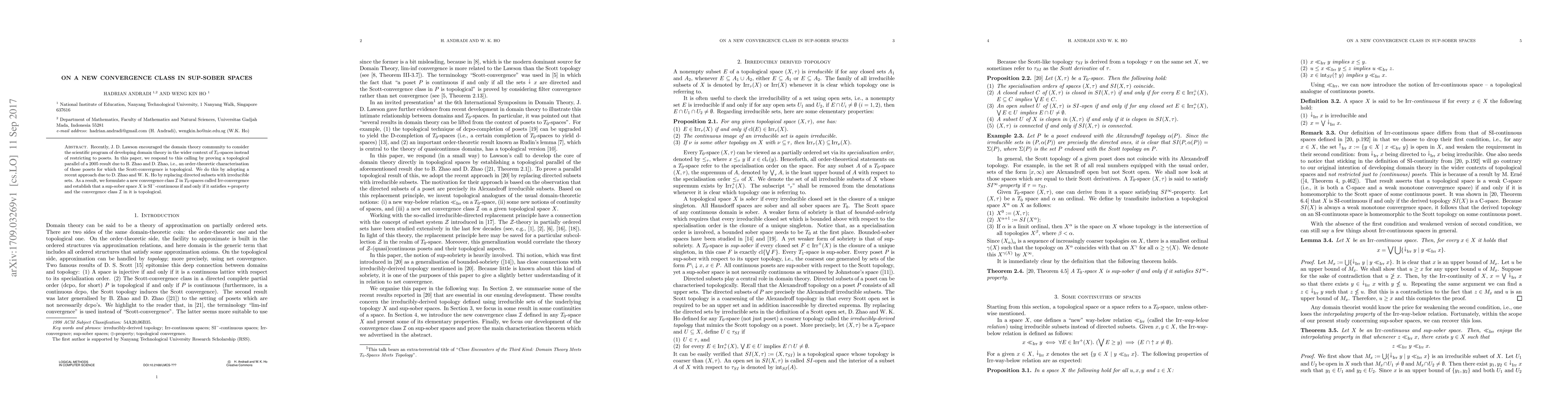 Recently, J. D. Lawson encouraged the domain theory community to consider the scientific program of developing domain theory in the wider context of $T_0$-spaces instead of restricting to posets. In this paper, we respond to this calling by proving a topological parallel of a 2005 result due to B. Zhao and D. Zhao, i.e., an order-theoretic characterisation of those posets for which the Scott-convergence is topological. We do this by adopting a recent approach due to D. Zhao and W. K. Ho by replacing directed subsets with irreducible sets. As a result, we formulate a new convergence class $\mathcal{I}$ in $T_0$-spaces called ${\operatorname{Irr}}$-convergence and establish that a sup-sober space $X$ is ${\operatorname{SI}}^{-}$-continuous if and only if it satisfies $*$-property and the convergence class $\mathcal{I}$ in it is topological.