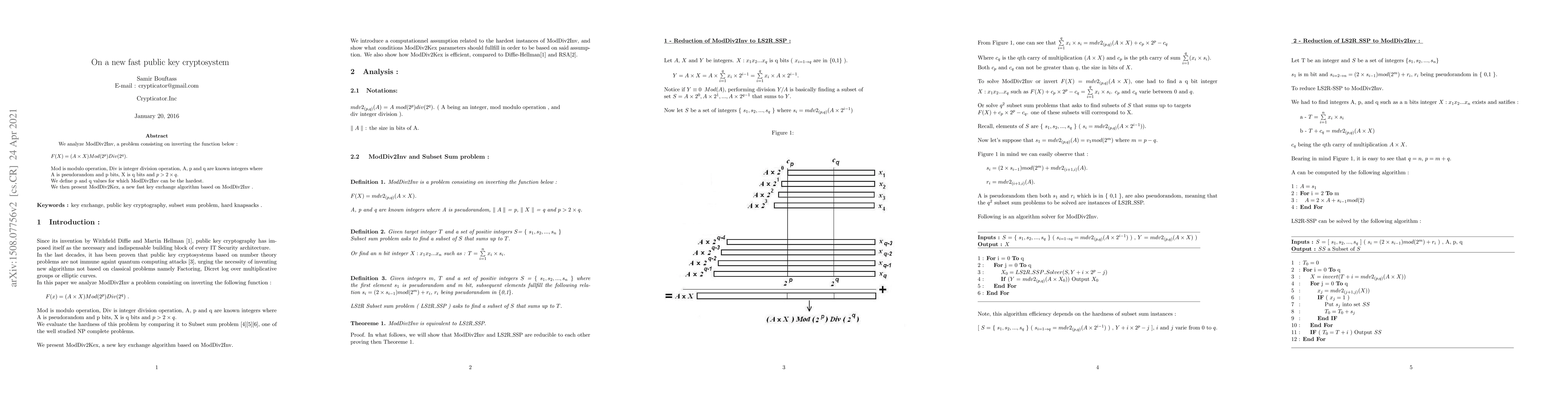 This paper introduces a new fast public key cryptosystem comprising a key exchange, encryption, and digital signature algorithm based on the invertibility difficulty of the function $$F(x) = (a \times x) \text{Mod}(2^p) \text{Div}(2^q)$$. The authors evaluate the problem's hardness by reducing it to SAT and propose ModDiv2Kex for efficient key exchange.