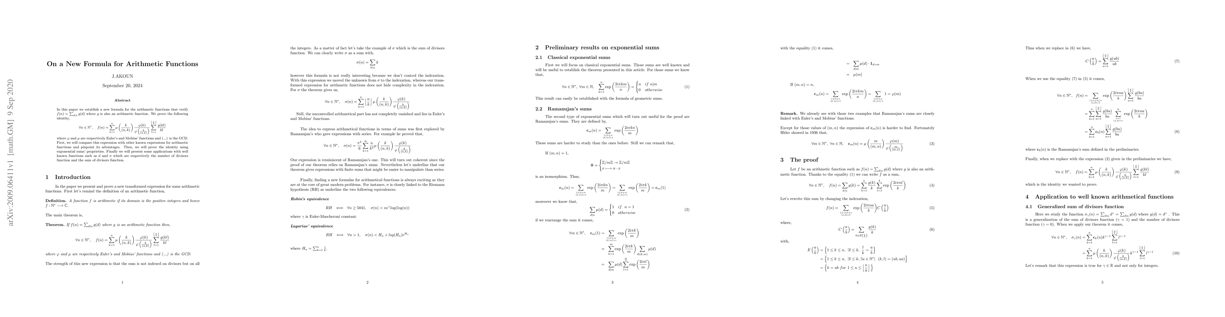 In this paper we establish a new formula for the arithmetic functions that verify $ f(n) = \sum_{d|n} g(d)$ where $g$ is also an arithmetic function. We prove the following identity, $$\forall n \in \mathbb{N}^*, \ \ \ f(n) = \sum_{k=1}^n \mu \left(\frac{k}{(n,k)}\right) \frac {\varphi(k)}{\varphi\left(\frac{k}{(n,k)}\right)} \sum_{l=1}^{\left\lfloor\frac{n}{k}\right\rfloor} \frac{g(kl)}{kl} $$ where $\varphi$ and $\mu$ are respectively Euler's and Mobius' functions and (.,.) is the GCD. First, we will compare this expression with other known expressions for arithmetic functions and pinpoint its advantages. Then, we will prove the identity using exponential sums' proprieties. Finally we will present some applications with well known functions such as $d$ and $\sigma$ which are respectively the number of divisors function and the sum of divisors function.