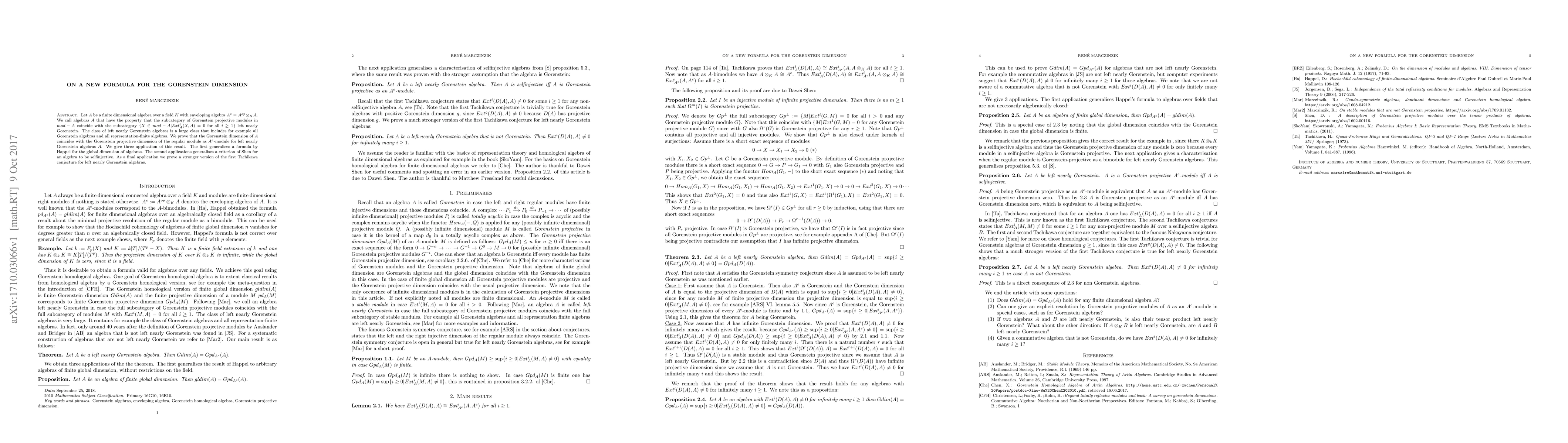 Let $A$ be a finite dimensional algebra over a field $K$ with enveloping algebra $A^e=A^{op} \otimes_K A$. We call algebras $A$ that have the property that the subcategory of Gorenstein projective modules in $mod-A$ coincide with the subcategory $\{ X \in mod-A | Ext_A^i(X,A)=0 $ for all $i \geq 1 \}$ left nearly Gorenstein. The class of left nearly Gorenstein algebras is a large class that includes for example all Gorenstein algebras and all representation-finite algebras. We prove that the Gorenstein dimension of $A$ coincides with the Gorenstein projective dimension of the regular module as $A^e$-module for left nearly Gorenstein algebras $A$. We give three application of this result. The first generalises a formula by Happel for the global dimension of algebras. The second application generalises a criterion of Shen for an algebra to be selfinjective. As a final application we prove a stronger version of the first Tachikawa conjecture for left nearly Gorenstein algebras.