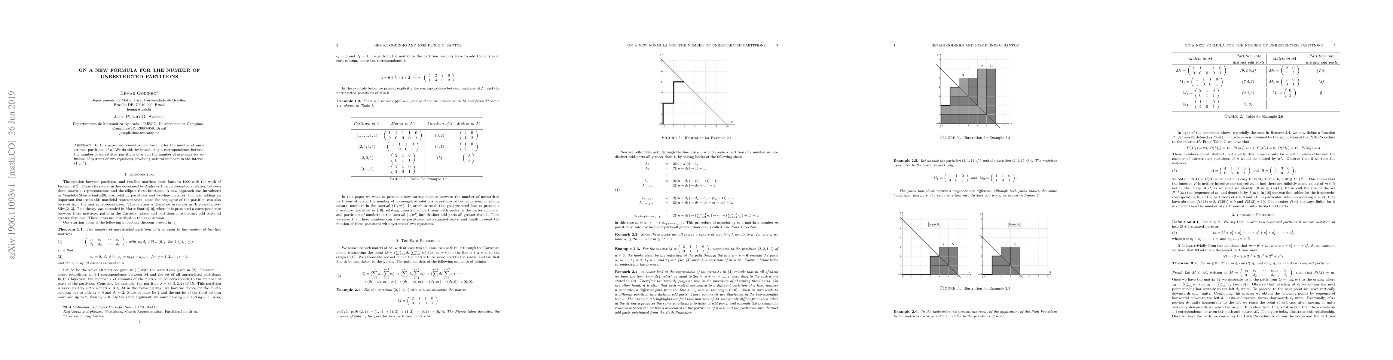 In this paper we present a new formula for the number of unrestricted partitions of $n$. We do this by introducing a correspondence between the number of unrestrited partitions of $n$ and the number of non-negative solutions of systems of two equations, involving natural numbers in the interval (1 $,n^{2}$).