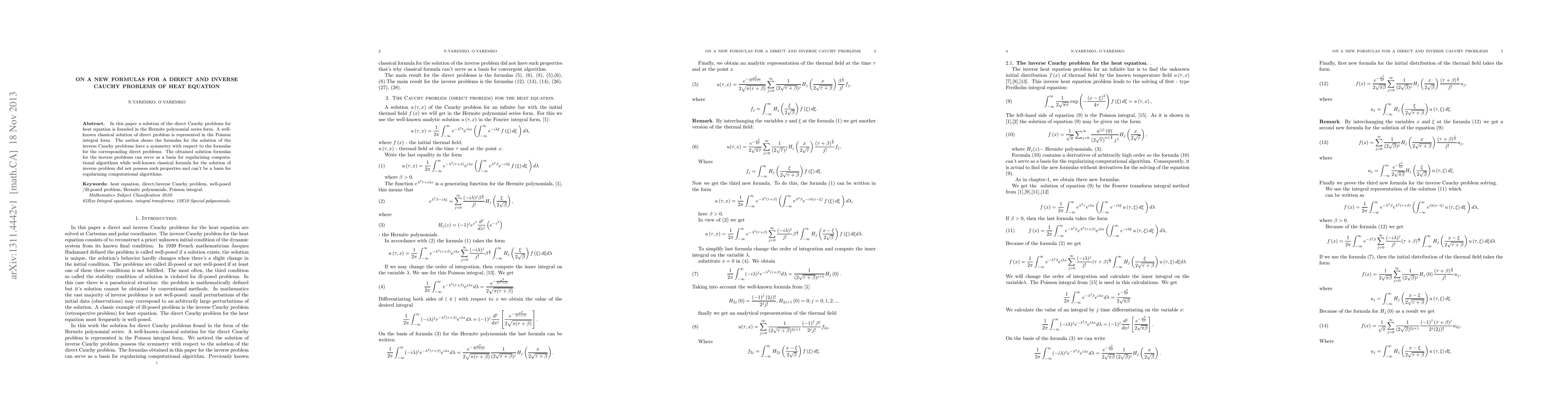 This paper presents new formulas for solving both direct and inverse Cauchy problems of the heat equation using Hermite polynomial series. It demonstrates that the solutions for inverse problems exhibit symmetry with respect to the direct problems, providing a foundation for regularization in computational algorithms.