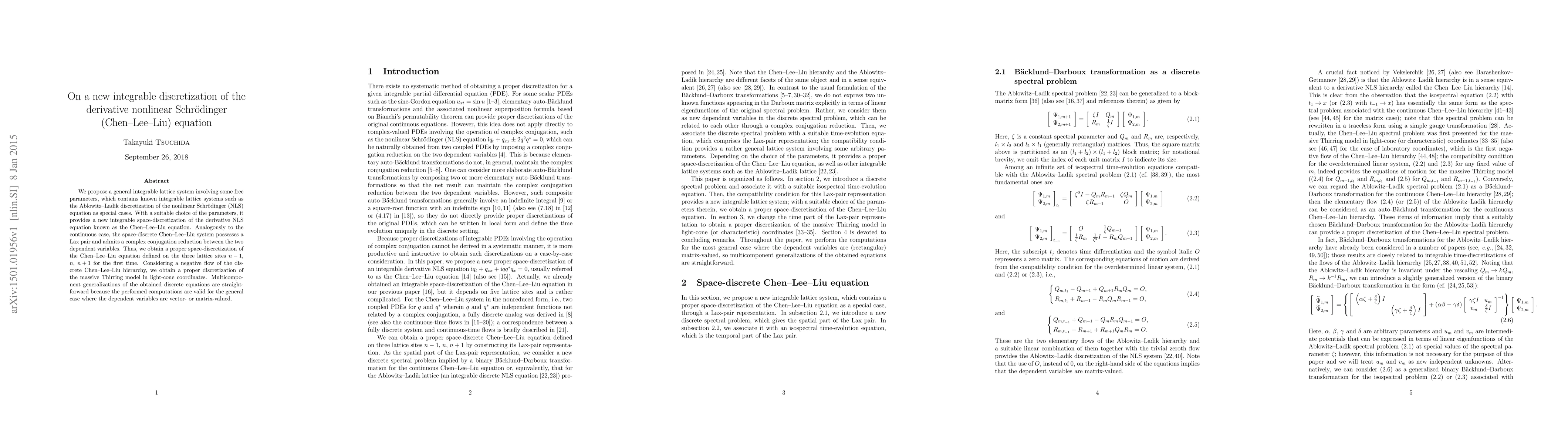 We propose a general integrable lattice system involving some free parameters, which contains known integrable lattice systems such as the Ablowitz-Ladik discretization of the nonlinear Schr\"odinger (NLS) equation as special cases. With a suitable choice of the parameters, it provides a new integrable space-discretization of the derivative NLS equation known as the Chen-Lee-Liu equation. Analogously to the continuous case, the space-discrete Chen-Lee-Liu system possesses a Lax pair and admits a complex conjugation reduction between the two dependent variables. Thus, we obtain a proper space-discretization of the Chen-Lee-Liu equation defined on the three lattice sites $n-1$, $n$, $n+1$ for the first time. Considering a negative flow of the discrete Chen-Lee-Liu hierarchy, we obtain a proper discretization of the massive Thirring model in light-cone coordinates. Multicomponent generalizations of the obtained discrete equations are straightforward because the performed computations are valid for the general case where the dependent variables are vector- or matrix-valued.