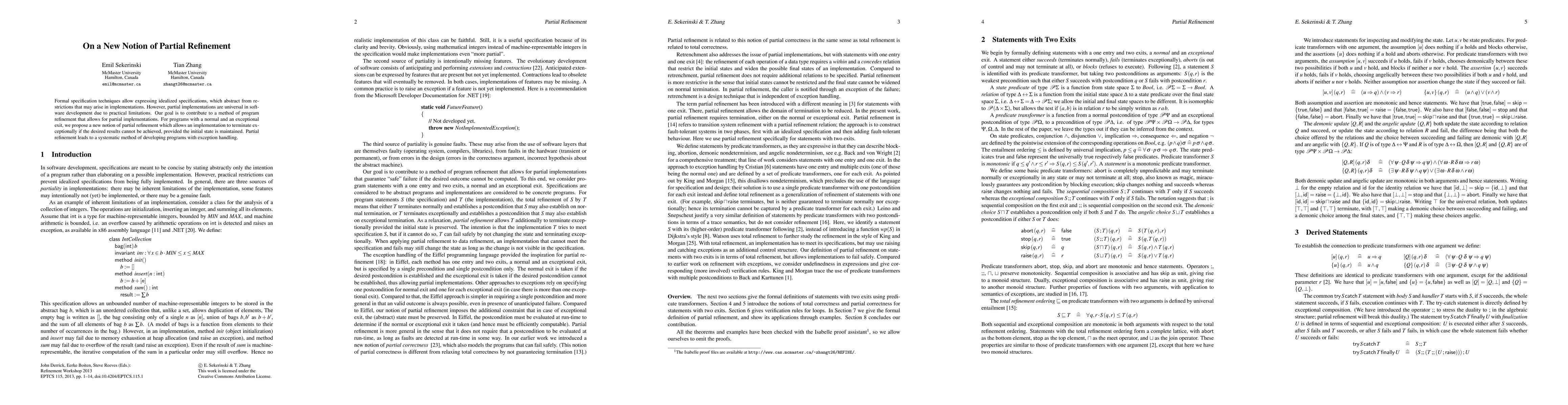 Formal specification techniques allow expressing idealized specifications, which abstract from restrictions that may arise in implementations. However, partial implementations are universal in software development due to practical limitations. Our goal is to contribute to a method of program refinement that allows for partial implementations. For programs with a normal and an exceptional exit, we propose a new notion of partial refinement which allows an implementation to terminate exceptionally if the desired results cannot be achieved, provided the initial state is maintained. Partial refinement leads to a systematic method of developing programs with exception handling.