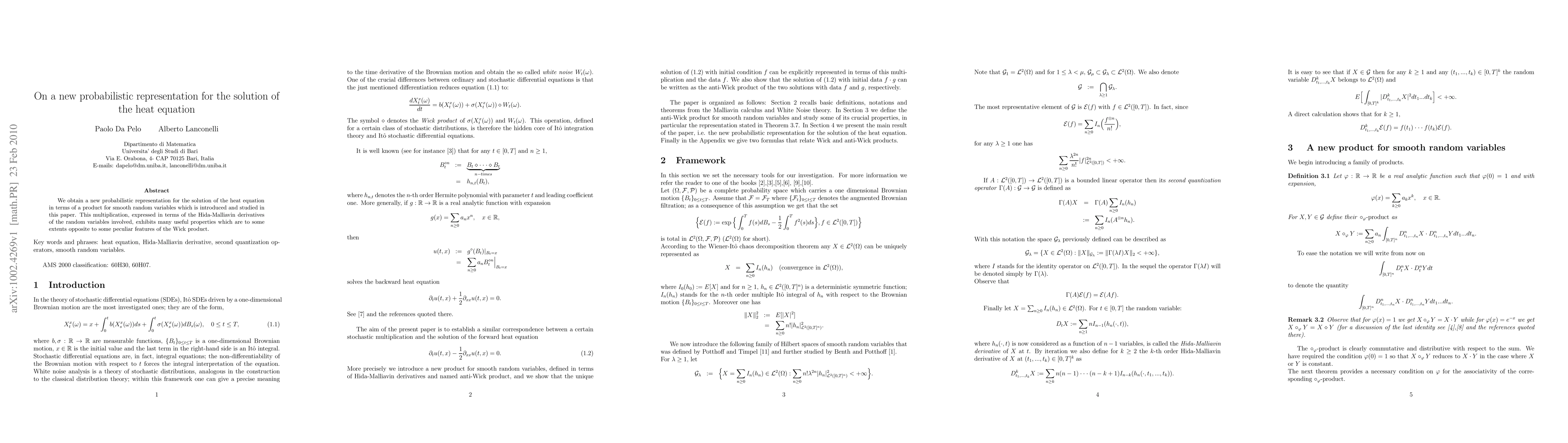 This paper introduces a novel probabilistic representation for the heat equation solution using a new multiplication for smooth random variables, expressed via Hida-Malliavin derivatives, which contrasts with the properties of the Wick product.