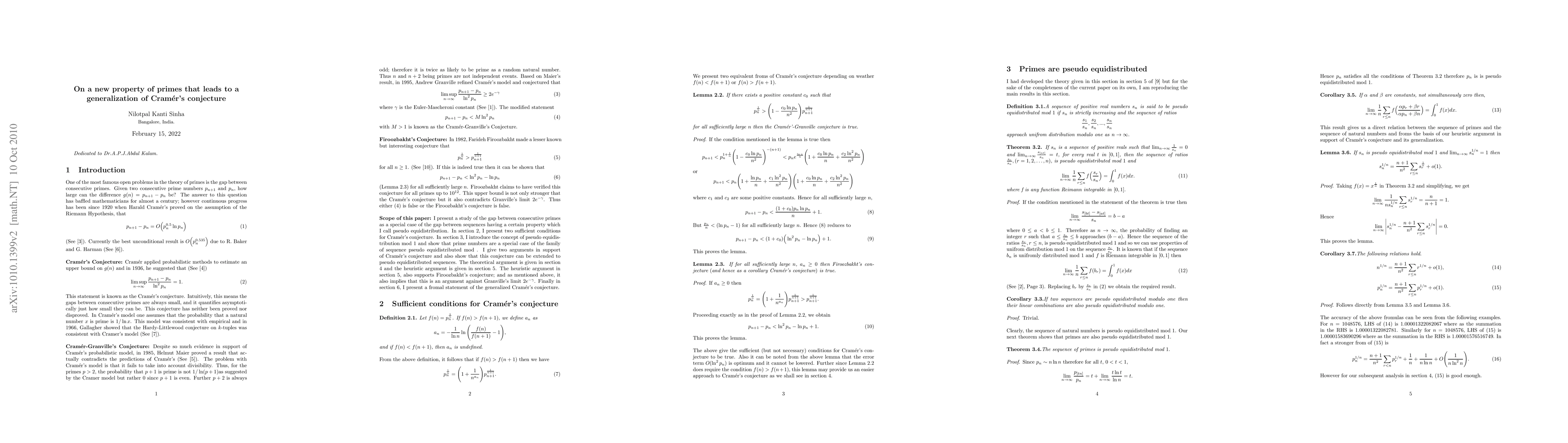 I present a new property of prime numbers that leads to a generalization of Cramer's conjecture. The study of the gap between consecutive primes is treated as a special case of the gap between consecutive terms of sequences having a certain property called pseudo equidistribution. Both rigorous as well as heuristic arguments are given in support of the generalized Cramer's conjectures.