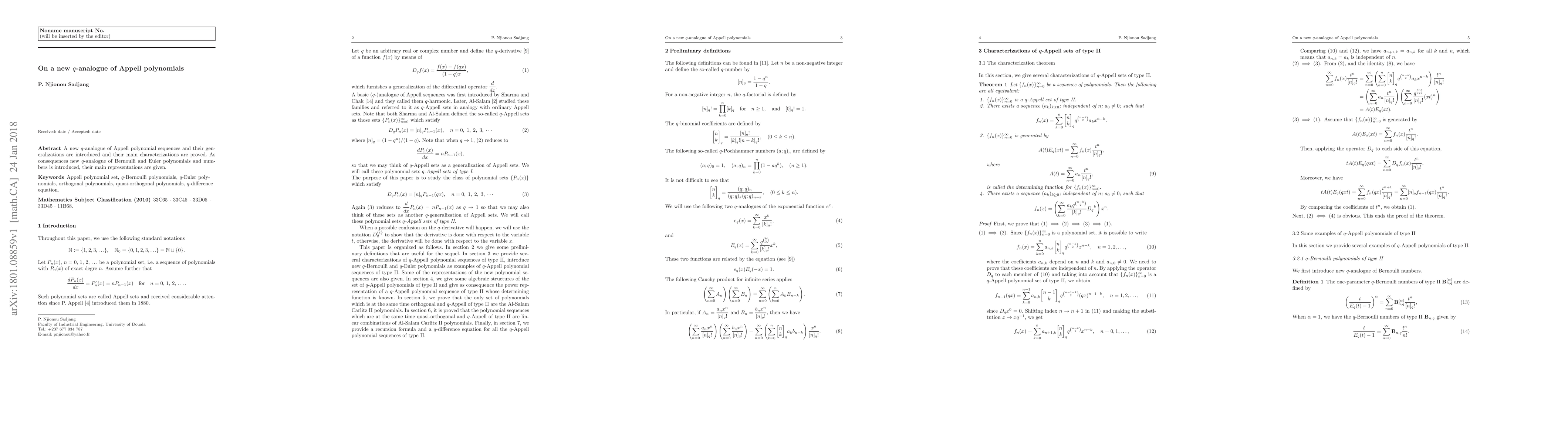 A new $q$-analogue of Appell polynomial sequences and their generalizations are introduced and their main characterizations are proved. As consequences new $q$-analogue of Bernoulli and Euler polynomials and numbers is introduced, their main representations are given.