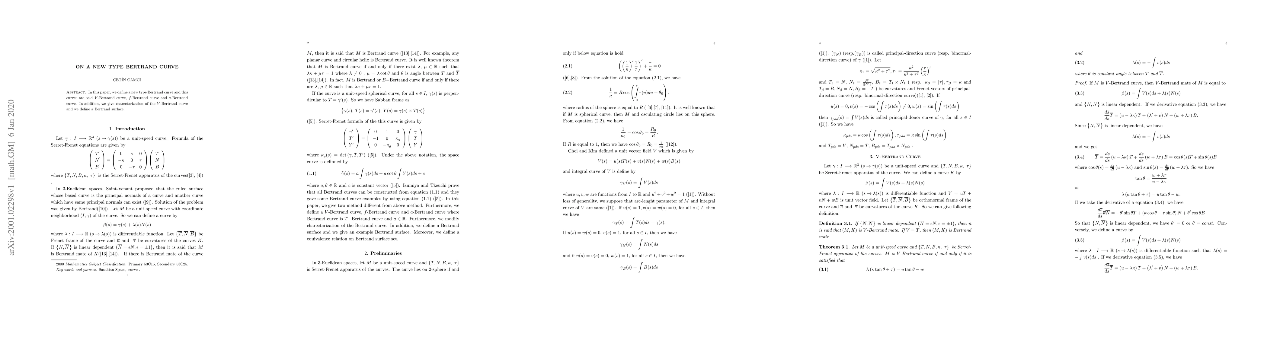 In this paper, we define a new type Bertrand curve and this curves are said V-Bertrand curve, f-Bertrand curve and a-Bertrand curve. In addition, we give charectarization of the V-Bertrand curve and we define a Bertrand surface.