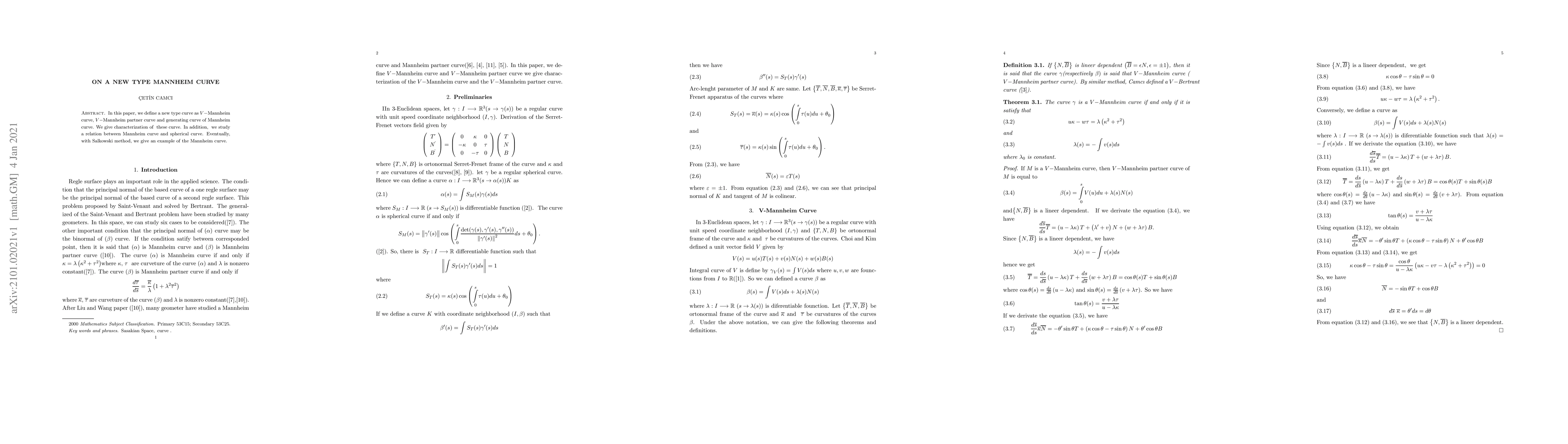 In this paper, we de\"One a new type curve as V-Mannheim curve, V Mannheim partner curve and generating curve of Mannheim curve. We give characterization of these curve. In addition, we study a relation between Mannheim curve and spherical curve. Eventually, with Salkowski method, we give an example of the Mannheim curve.