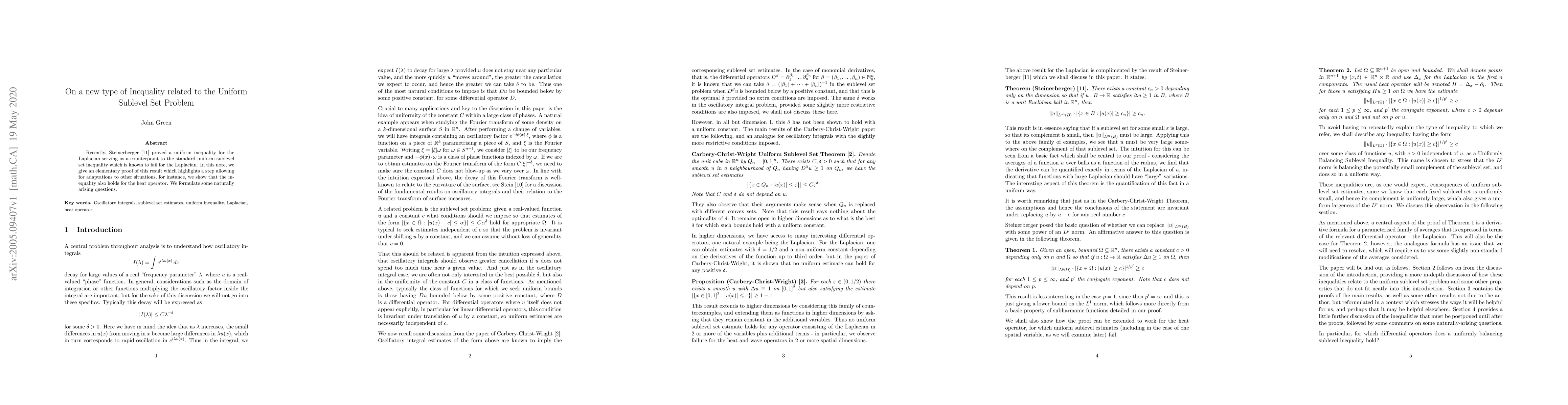 Recently, Steinerberger proved a uniform inequality for the Laplacian serving as a counterpoint to the standard uniform sublevel set inequality which is known to fail for the Laplacian. In this note, we give an elementary proof of this result which highlights a step allowing for adaptations to other situations, for instance, we show that the inequality also holds for the heat operator. We formulate some naturally arising questions.