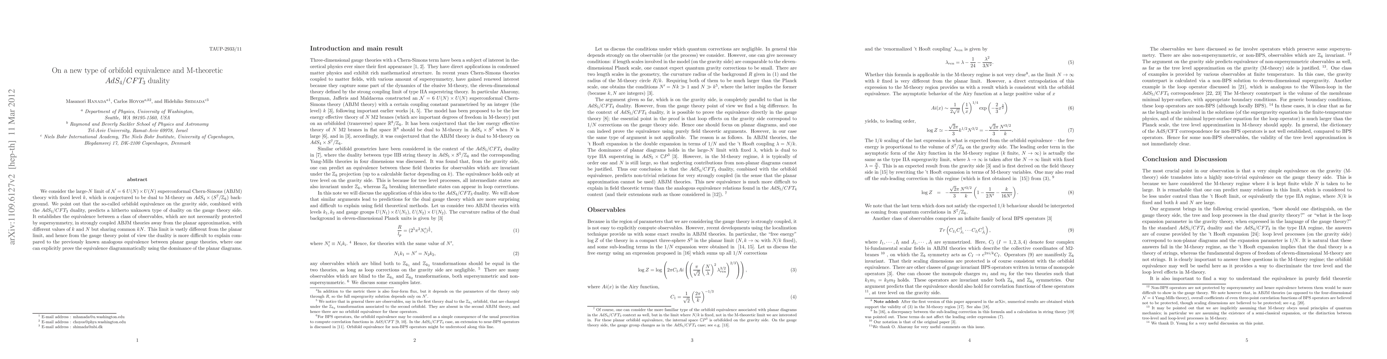 We consider the large-N limit of \mathcal{N}=6 U(N) \times U(N) superconformal Chern-Simons (ABJM) theory with fixed level k, which is conjectured to be dual to M-theory on AdS4\times (S^7/Z_k) background. We point out that the so-called orbifold equivalence on the gravity side, combined with the AdS4/CFT3 duality, predicts a hitherto unknown type of duality on the gauge theory side. It establishes the equivalence between a class of observables, which are not necessarily protected by supersymmetry, in strongly coupled ABJM theories away from the planar approximation, with different values of k and N but sharing common kN. This limit is vastly different from the planar limit, and hence from the gauge theory point of view the duality is more difficult to explain compared to the previously known analogous equivalence between planar gauge theories, where one can explicitly prove the equivalence diagrammatically using the dominance of the planar diagrams.