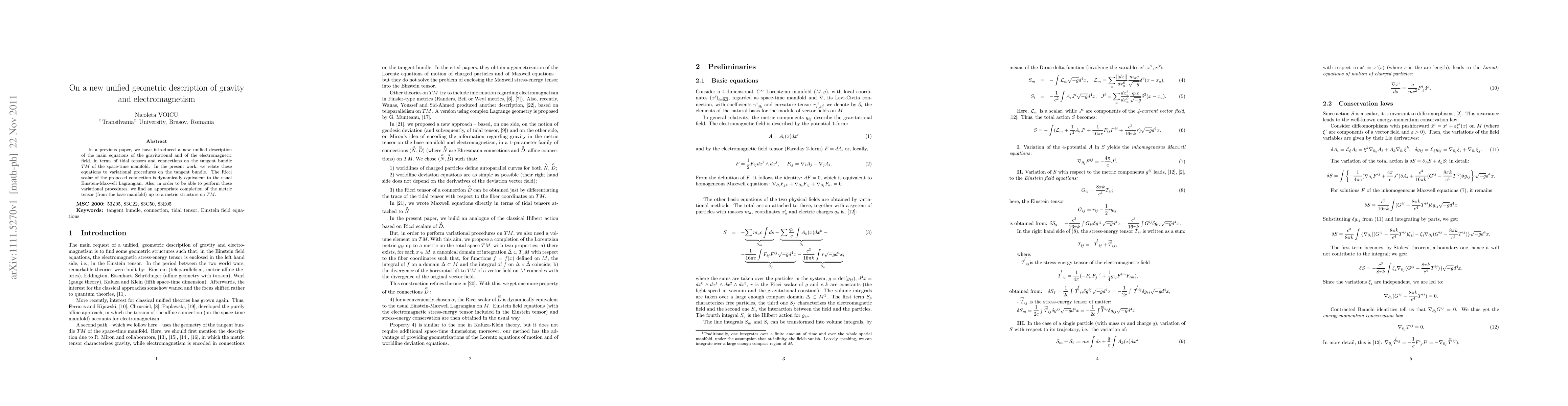 In a previous paper, we have introduced a new unified description of the main equations of the gravitational and of the electromagnetic field, in terms of tidal tensors and connections on the tangent bundle TM of the space-time manifold. In the present work, we relate these equations to variational procedures on the tangent bundle. The Ricci scalar of the proposed connection is dynamically equivalent to the usual Einstein-Maxwell Lagrangian. Also, in order to be able to perform these variational procedures, we find an appropriate completion of the metric tensor (from the base manifold) up to a metric structure on TM.