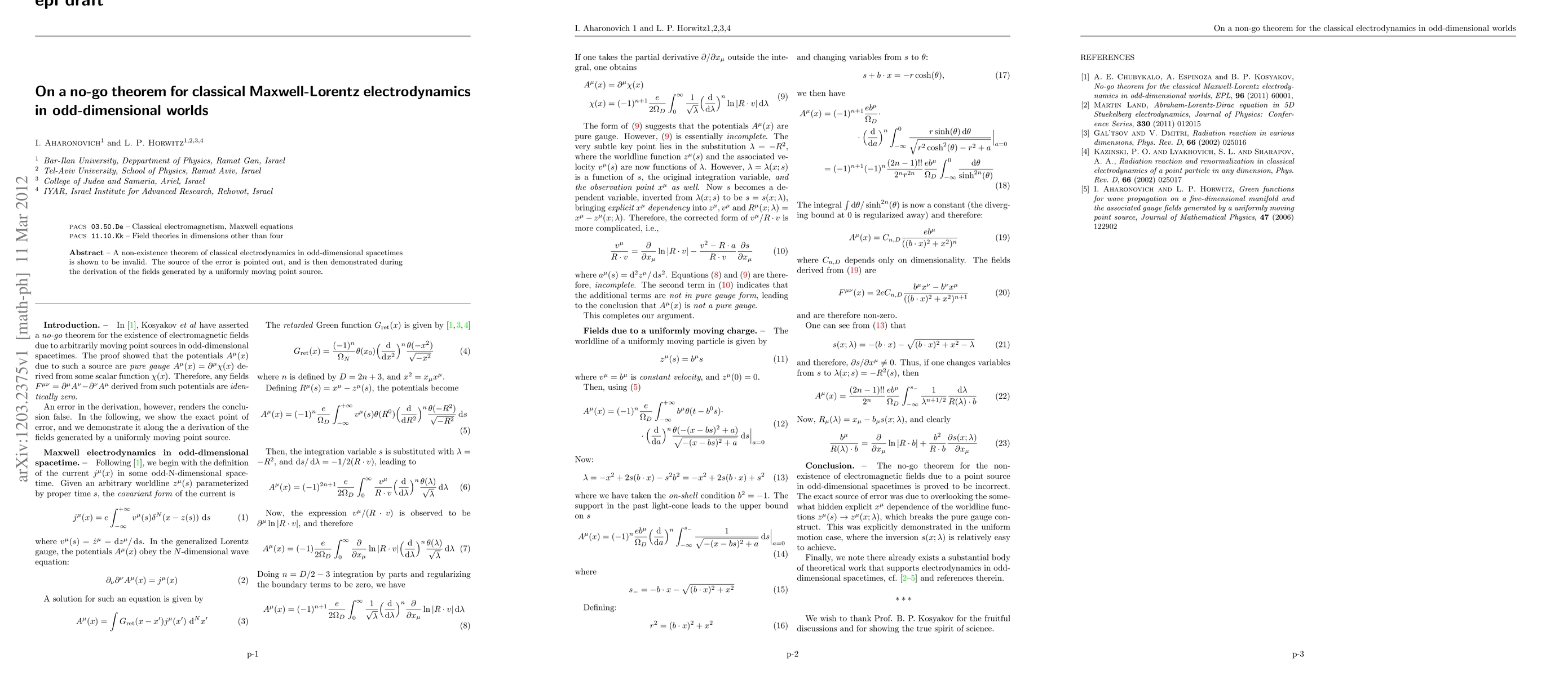 Summary: The paper refutes a previously established no-go theorem for classical Maxwell-Lorentz electrodynamics in odd-dimensional spacetimes, identifying and correcting the error in the original derivation, particularly in the context of fields from a uniformly moving point source.