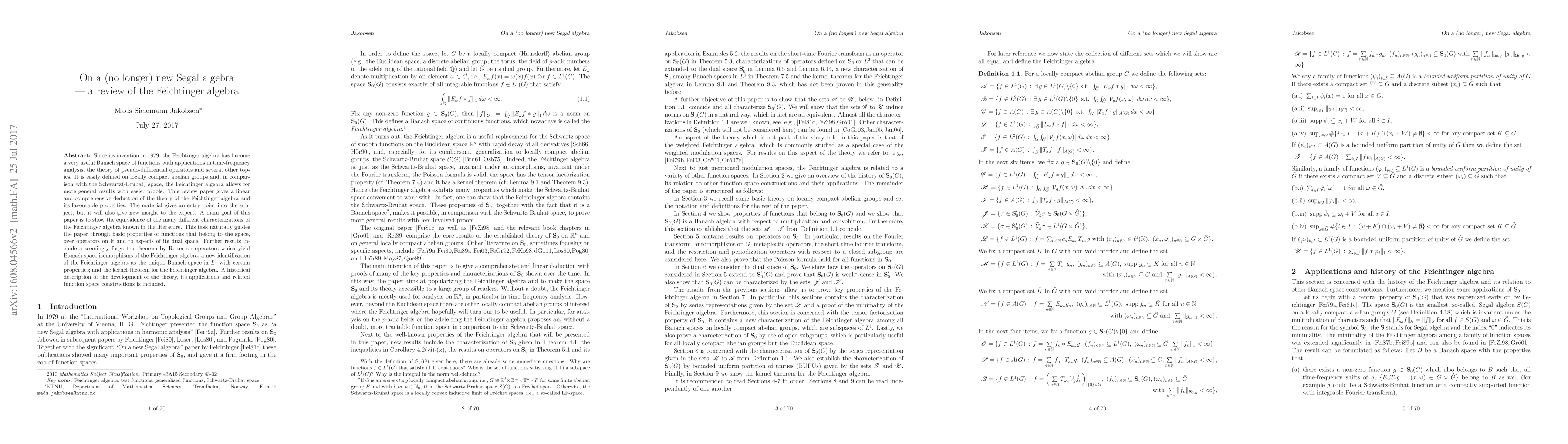 Since its invention in 1979, the Feichtinger algebra has become a very useful Banach space of functions with applications in time-frequency analysis, the theory of pseudo-differential operators and several other topics. It is easily defined on locally compact abelian groups and, in comparison with the Schwartz(-Bruhat) space, the Feichtinger algebra allows for more general results with easier proofs. This review paper gives a linear and comprehensive deduction of the theory of the Feichtinger algebra and its favourable properties. The material gives an entry point into the subject, but it will also give new insight to the expert. A main goal of this paper is to show the equivalence of the many different characterizations of the Feichtinger algebra known in the literature. This task naturally guides the paper through basic properties of functions that belong to the space, over operators on it and to aspects of its dual space. Further results include a seemingly forgotten theorem by Reiter on operators which yield Banach space isomorphisms of the Feichtinger algebra; a new identification of the Feichtinger algebra as the unique Banach space in $L^{1}$ with certain properties; and the kernel theorem for the Feichtinger algebra. A historical description of the development of the theory, its applications and related function space constructions is included.