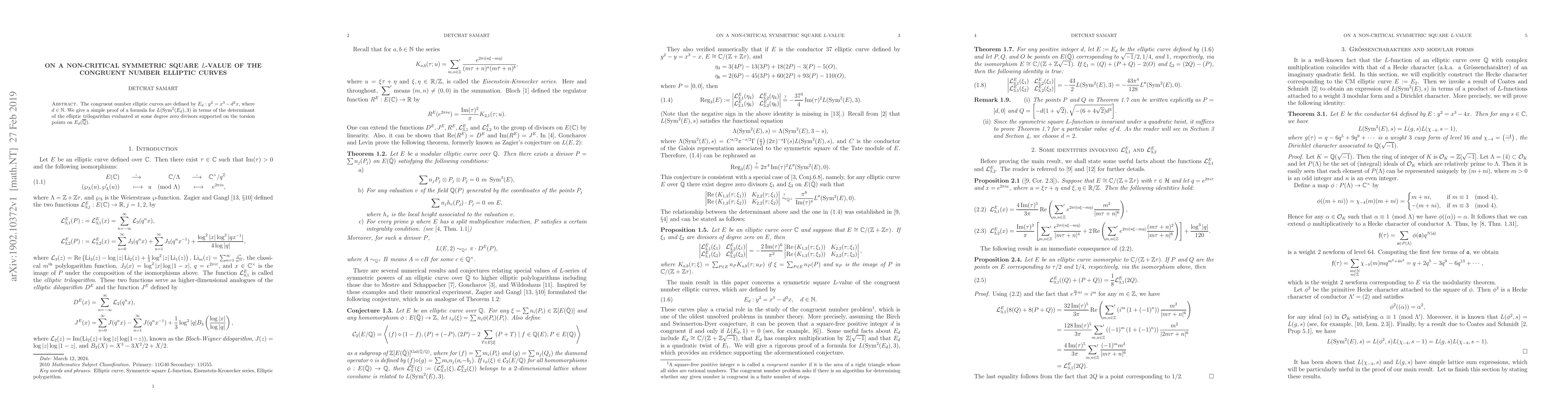 The congruent number elliptic curves are defined by $E_d: y^2=x^3-d^2x$, where $d\in \mathbb{N}.$ We give a simple proof of a formula for $L(\mathrm{Sym}^2(E_d),3)$ in terms of the determinant of the elliptic trilogarithm evaluated at some degree zero divisors supported on the torsion points on $E_d(\overline{\mathbb{Q}})$.