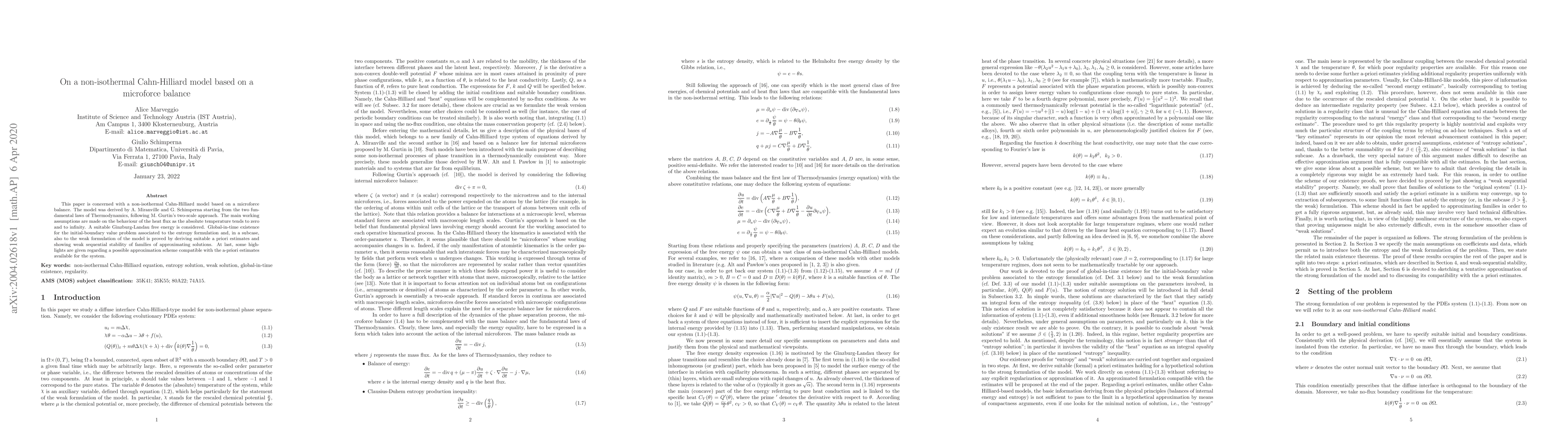 This paper is concerned with a non-isothermal Cahn-Hilliard model based on a microforce balance. The model was derived by A. Miranville and G. Schimperna starting from the two fundamental laws of Thermodynamics, following M. Gurtin's two-scale approach. The main working assumptions are made on the behaviour of the heat flux as the absolute temperature tends to zero and to infinity. A suitable Ginzburg-Landau free energy is considered. Global-in-time existence for the initial-boundary value problem associated to the entropy formulation and, in a subcase, also to the weak formulation of the model is proved by deriving suitable a priori estimates and showing weak sequential stability of families of approximating solutions. At last, some highlights are given regarding a possible approximation scheme compatible with the a-priori estimates available for the system.