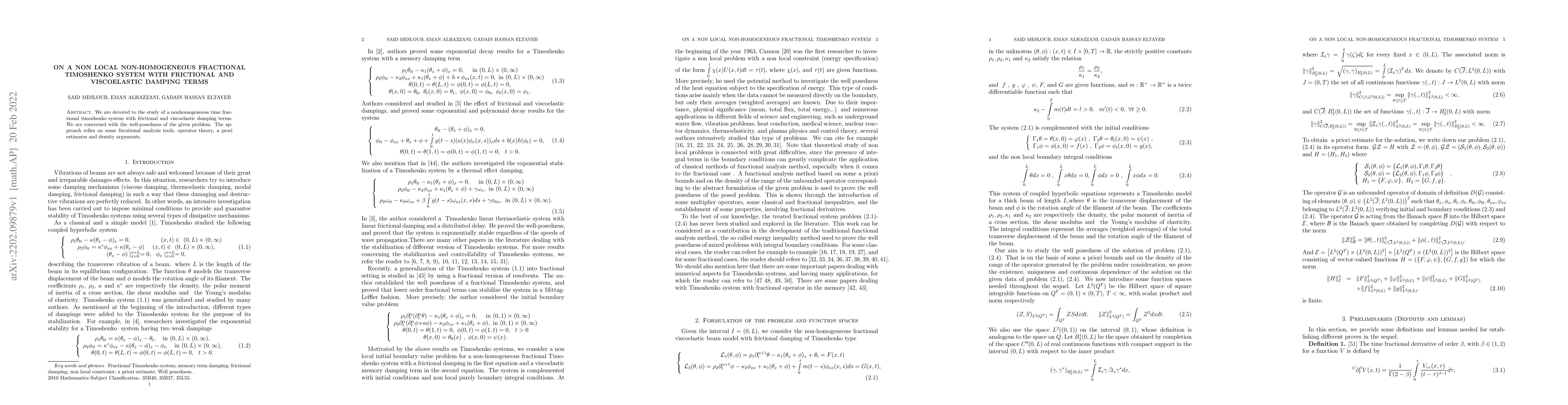 Summary: This paper investigates the well-posedness of a nonlocal non-homogeneous fractional Timoshenko system incorporating frictional and viscoelastic damping. The study employs functional-analysis techniques, operator theory, and a priori estimates to achieve its results.