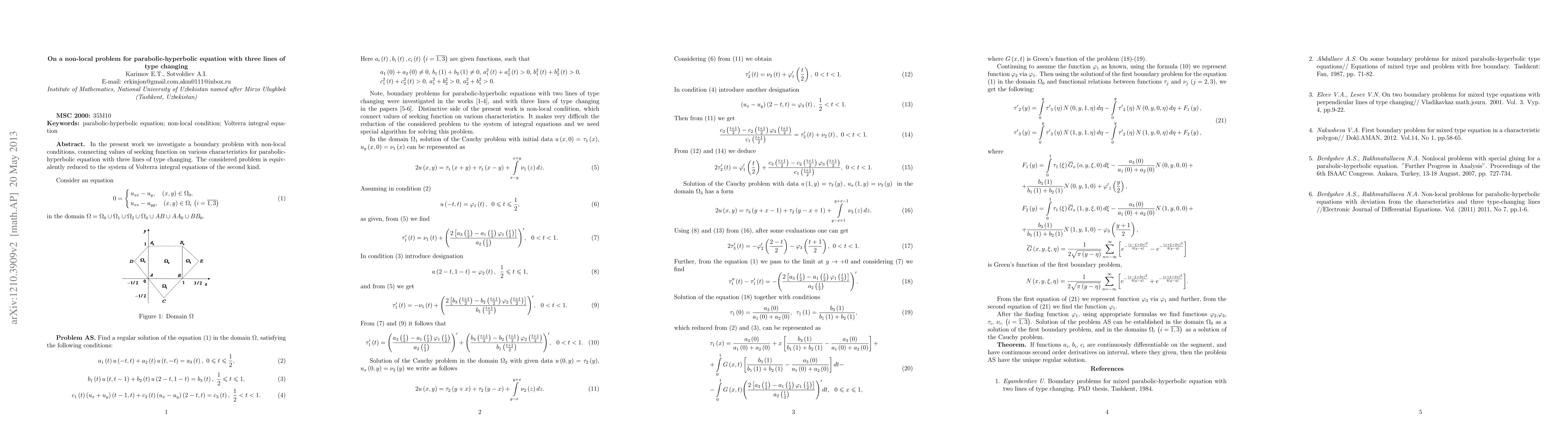 Summary: This paper studies a boundary problem for a parabolic-hyperbolic equation with three type-changing lines, featuring non-local conditions that link the solution across different characteristics. The problem is reformulated as a system of Volterra integral equations of the second kind.