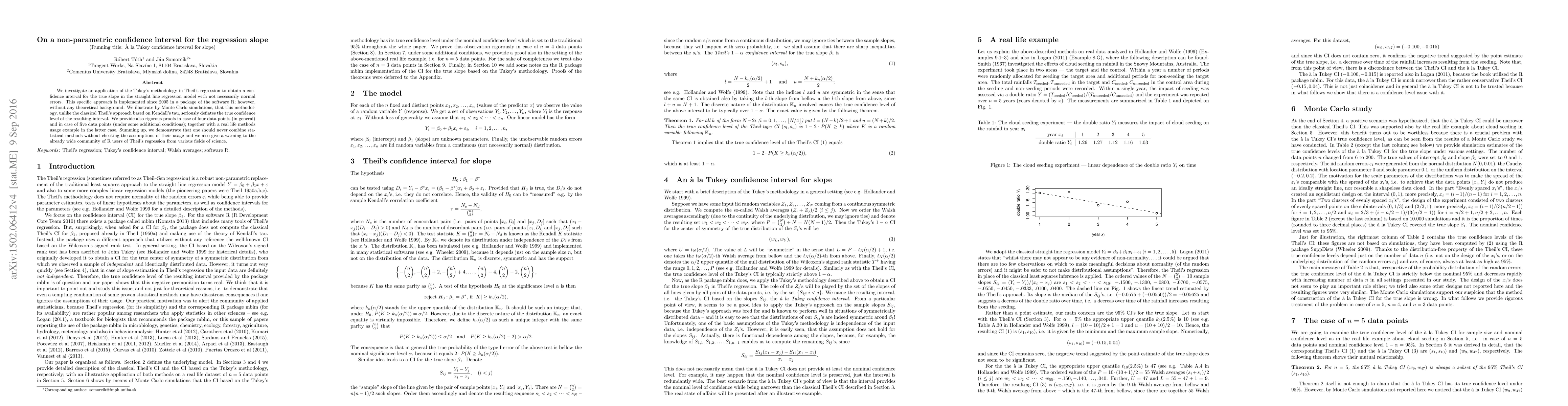 We investigate an application of the Tukey's methodology in Theil's regression to obtain a confidence interval for the true slope in the straight line regression model with not necessarily normal errors. This specific approach is implemented since 2005 in a package of the software R; however, without any theoretical background. We illustrate by Monte Carlo simulations, that this methodology, unlike the classical Theil's approach based on Kendall's tau, seriously deflates the true confidence level of the resulting interval. We provide also rigorous proofs in case of four data points (in general) and in case of five data points (under some additional conditions); together with a real life methods usage example in the latter case. Summing up, we demonstrate that one should never combine statistical methods without checking the assumptions of their usage and we also give a warning to the already wide community of R users of Theil's regression from various fields of science.