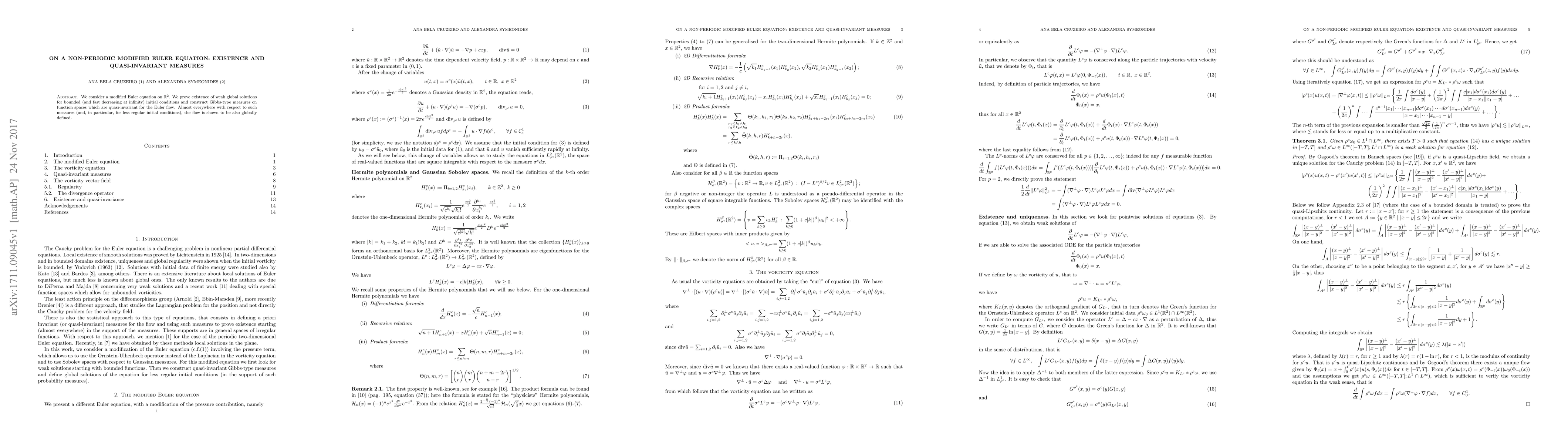 We consider a modified Euler equation on $\mathbb R^2$. We prove existence of weak global solutions for bounded (and fast decreasing at infinity) initial conditions and construct Gibbs-type measures on function spaces which are quasi-invariant for the Euler flow. Almost everywhere with respect to such measures (and, in particular, for less regular initial conditions), the flow is shown to be also globally defined.