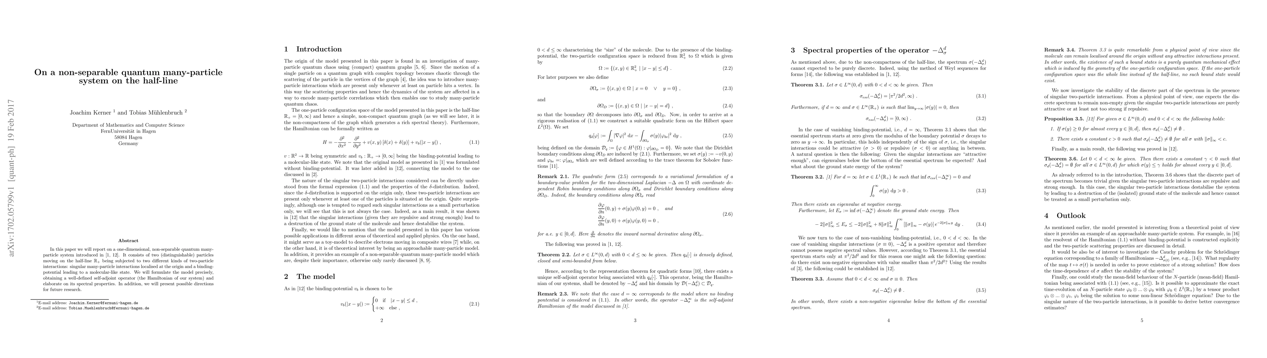 In this paper we will report on a one-dimensional, non-separable quantum many-particle system introduced in [arXiv:1504.08283,arXiv:1604.06693]. It consists of two (distinguishable) particles moving on the half-line being subjected to two different kinds of two-particle interactions: singular many-particle interactions localised at the origin and a binding-potential leading to a molecular-like state. We will formulate the model precisely, obtaining a well-defined self-adjoint operator (the Hamiltonian of our system) and elaborate on its spectral properties. In addition, we will present possible directions for future research.