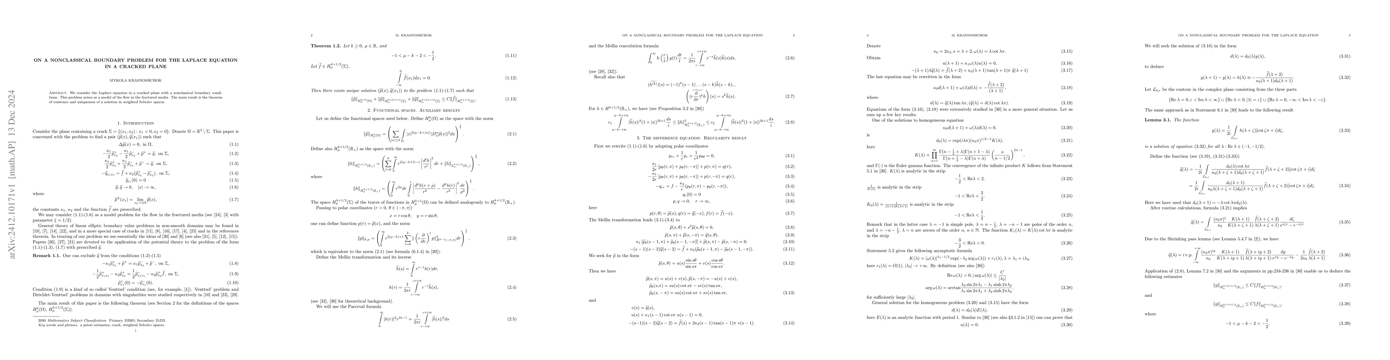 Summary: The research investigates the Laplace equation in a cracked plane with nonclassical boundary conditions, modeling flow in fractured media, and proves the existence and uniqueness of solutions in weighted Sobolev spaces.