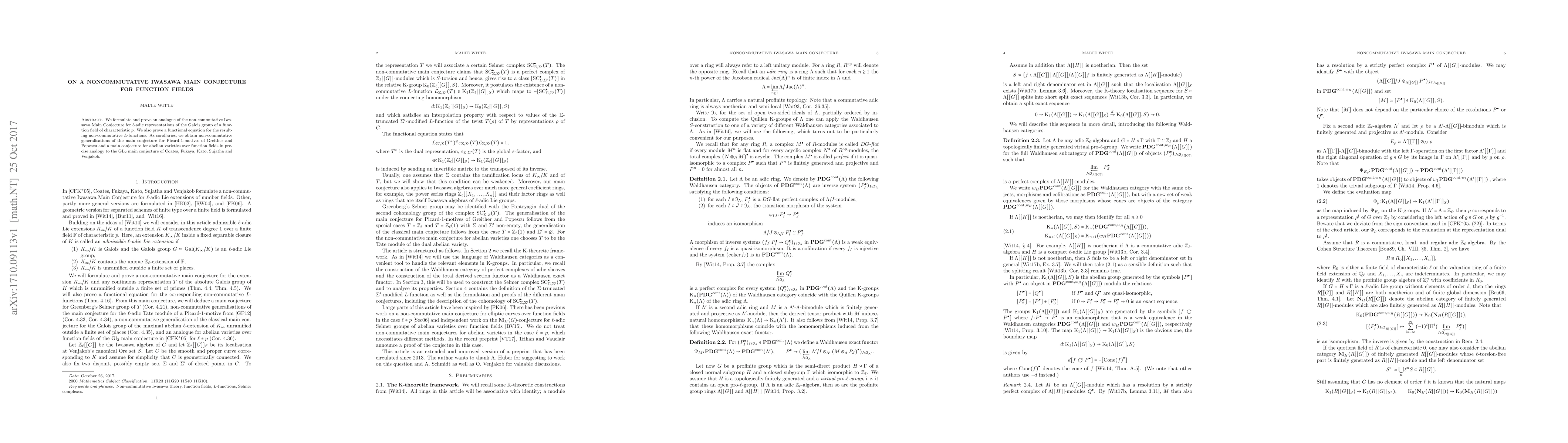 This paper formulates and proves a non-commutative Iwasawa Main Conjecture for $\ell$-adic representations of the Galois group of a function field in characteristic $p$, establishing a functional equation for the associated non-commutative $L$-functions and deriving generalizations of the main conjecture for Picard-$1$-motives and abelian varieties.