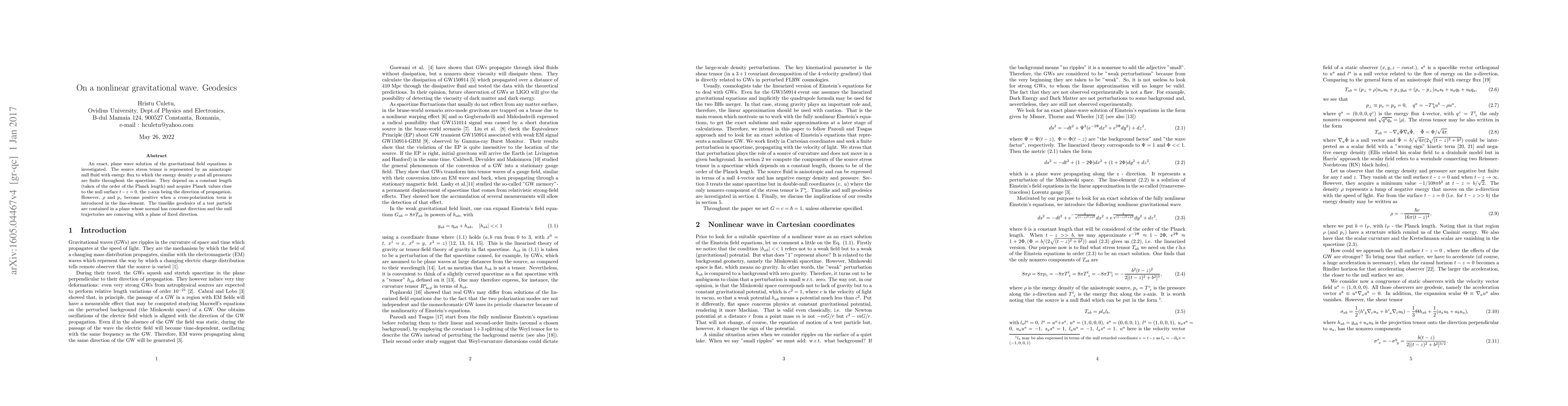 This paper investigates an exact plane wave solution for nonlinear gravitational waves sourced by an anisotropic null fluid, where the energy density and pressures are finite and approach Planck values near the null surface. The study reveals that timelike geodesics of test particles lie in a plane with a constant normal direction, while null trajectories are aligned with a plane of fixed direction.