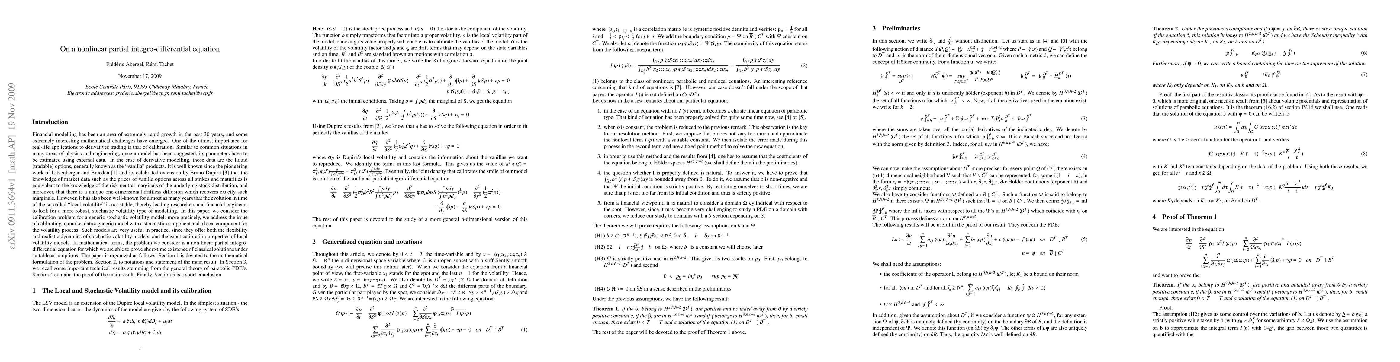 Consistently fitting vanilla option surfaces is an important issue when it comes to modelling in finance. Local volatility models introduced by Dupire in 1994 are widely used to price and manage the risks of structured products. However, the inconsistencies observed between the dynamics of the smile in those models and in real markets motivate researches for stochastic volatility modelling. Combining both those ideas to form Local and Stochastic Volatility models is of interest for practitioners. In this paper, we study the calibration of the vanillas in those models. This problem can be written as a nonlinear and nonlocal partial differential equation, for which we prove short-time existence of solutions.