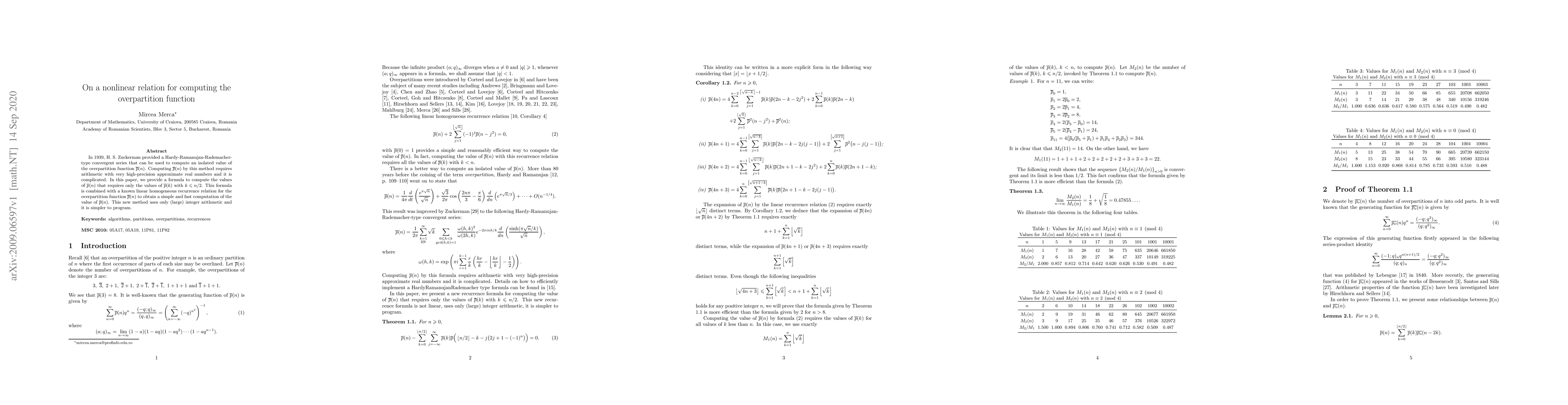 In 1939, H. S. Zuckerman provided a Hardy-Ramanujan-Rademacher-type convergent series that can be used to compute an isolated value of the overpartition function $\overline{p}(n)$. Computing $\overline{p}(n)$ by this method requires arithmetic with very high-precision approximate real numbers and it is complicated. In this paper, we provide a formula to compute the values of $\overline{p}(n)$ that requires only the values of $\overline{p}(k)$ with $k\leqslant n/2$. This formula is combined with a known linear homogeneous recurrence relation for the overpartition function $\overline{p}(n)$ to obtain a simple and fast computation of the value of $\overline{p}(n)$. This new method uses only (large) integer arithmetic and it is simpler to program.