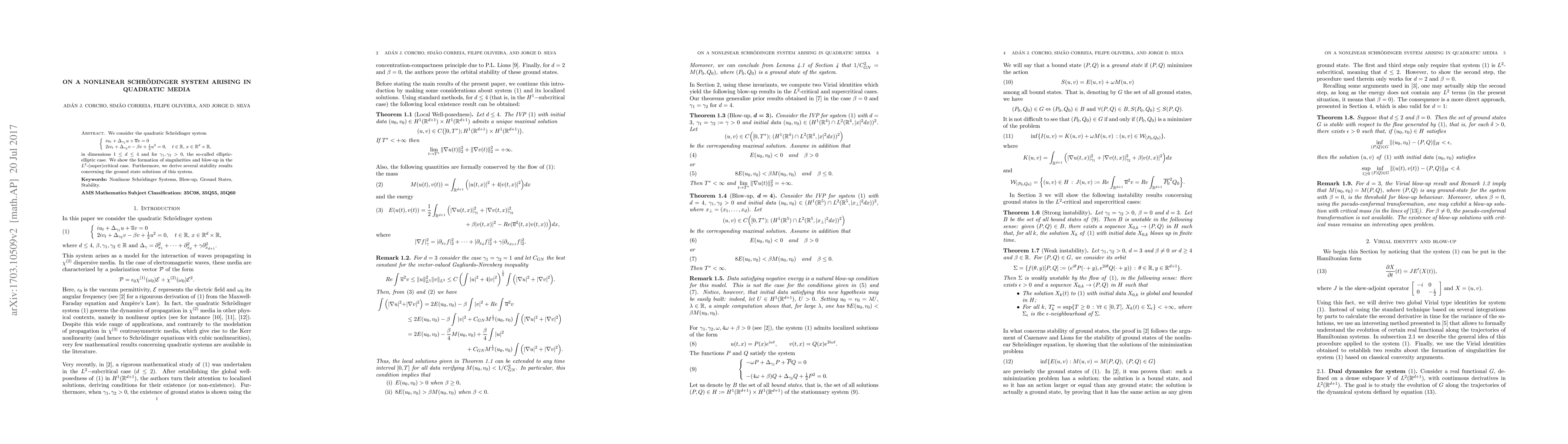 We consider the quadratic Schr\"odinger system $$iu_t+\Delta_{\gamma_1}u+\overline{u}v=0$$ $$2iv_t+\Delta_{\gamma_2}v-\beta v+\frac 12 u^2=0,$$ where $t\in\mathbf{R},\,x\in \mathbf{R}^d\times \mathbf{R}$, in dimensions $1\leq d\leq 4$ and for $\gamma_1,\gamma_2>0$, the so-called elliptic-elliptic case. We show the formation of singularities and blow-up in the $L^2$-(super)critical case. Furthermore, we derive several stability results concerning the ground state solutions of this system.