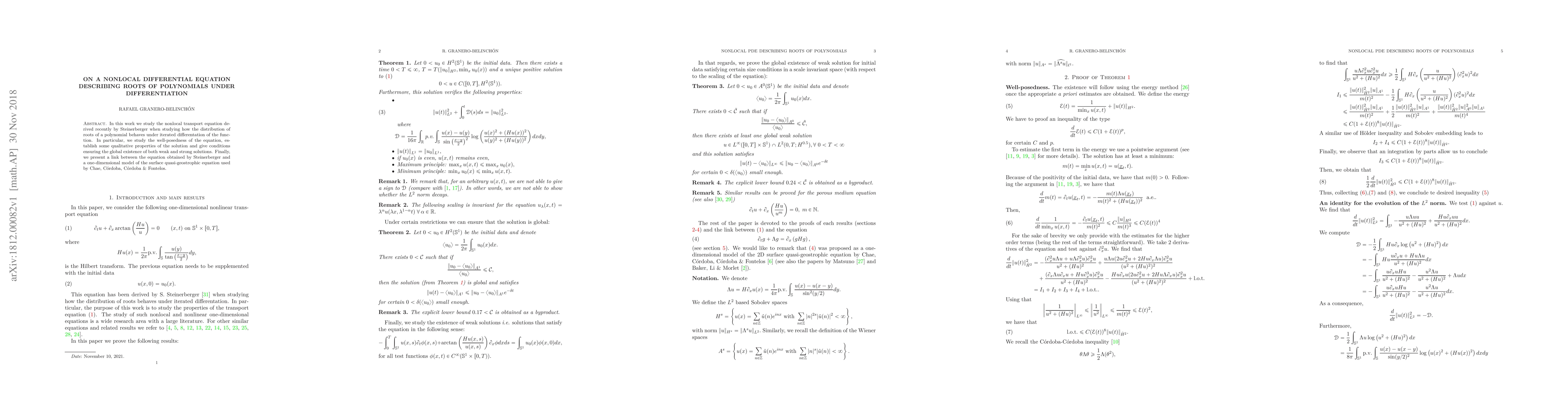 This paper investigates the nonlocal transport equation derived by Steinerberger concerning the behavior of polynomial roots under differentiation, establishing well-posedness, qualitative properties, and conditions for global existence of solutions, and drawing a connection to the surface quasi-geostrophic equation.