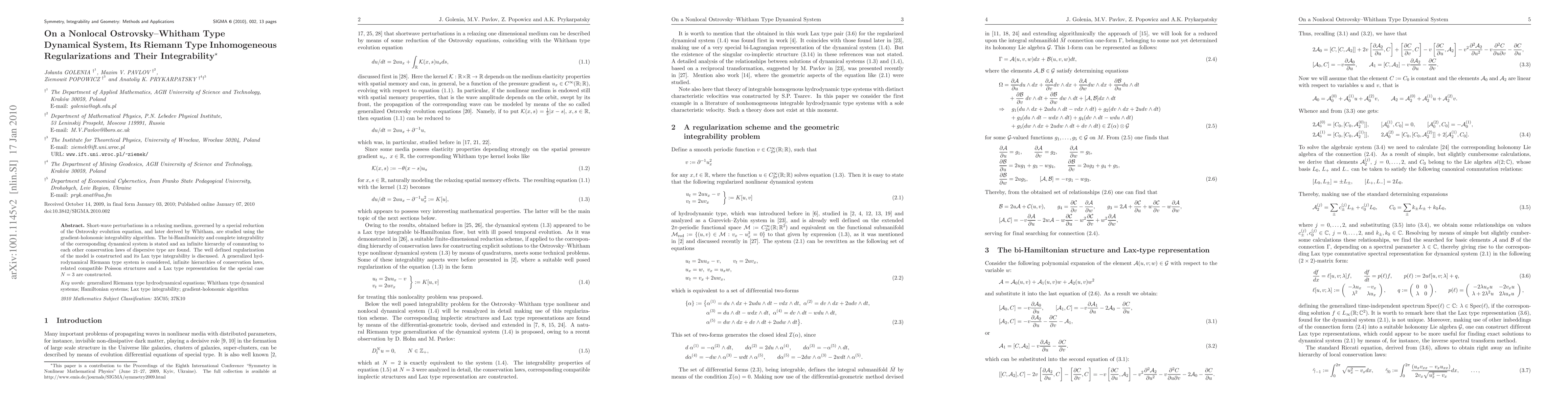 Short-wave perturbations in a relaxing medium, governed by a special reduction of the Ostrovsky evolution equation, and later derived by Whitham, are studied using the gradient-holonomic integrability algorithm. The bi-Hamiltonicity and complete integrability of the corresponding dynamical system is stated and an infinite hierarchy of commuting to each other conservation laws of dispersive type are found. The well defined regularization of the model is constructed and its Lax type integrability is discussed. A generalized hydrodynamical Riemann type system is considered, infinite hierarchies of conservation laws, related compatible Poisson structures and a Lax type representation for the special case N=3 are constructed.