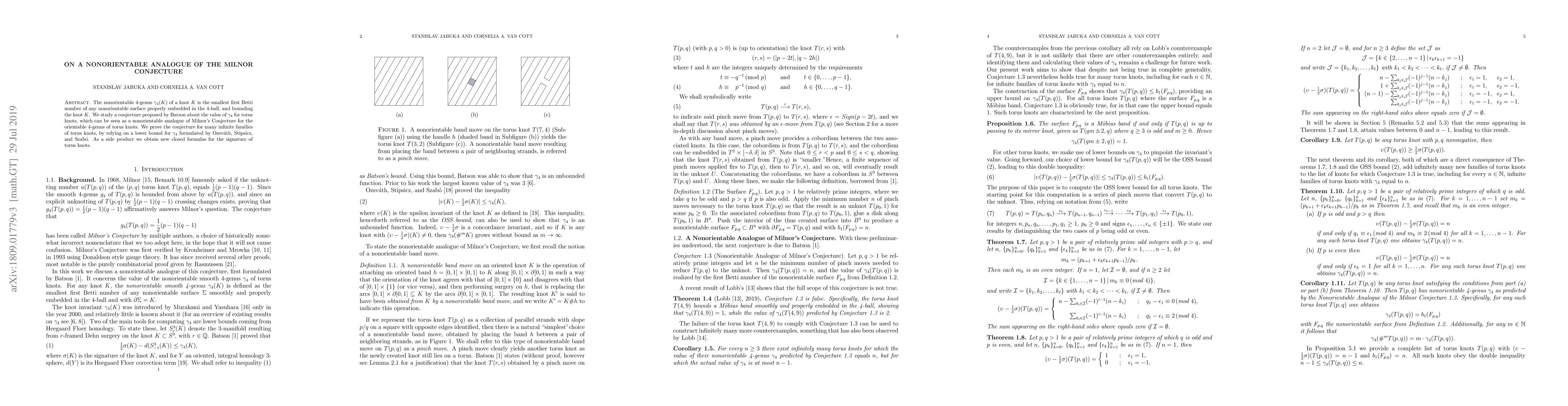 This paper proves Batson's conjecture regarding the nonorientable 4-genus $\gamma_4$ for many infinite families of torus knots, establishing a nonorientable analogue of Milnor's conjecture. It also provides new closed formulas for the signature of torus knots as a side product.
