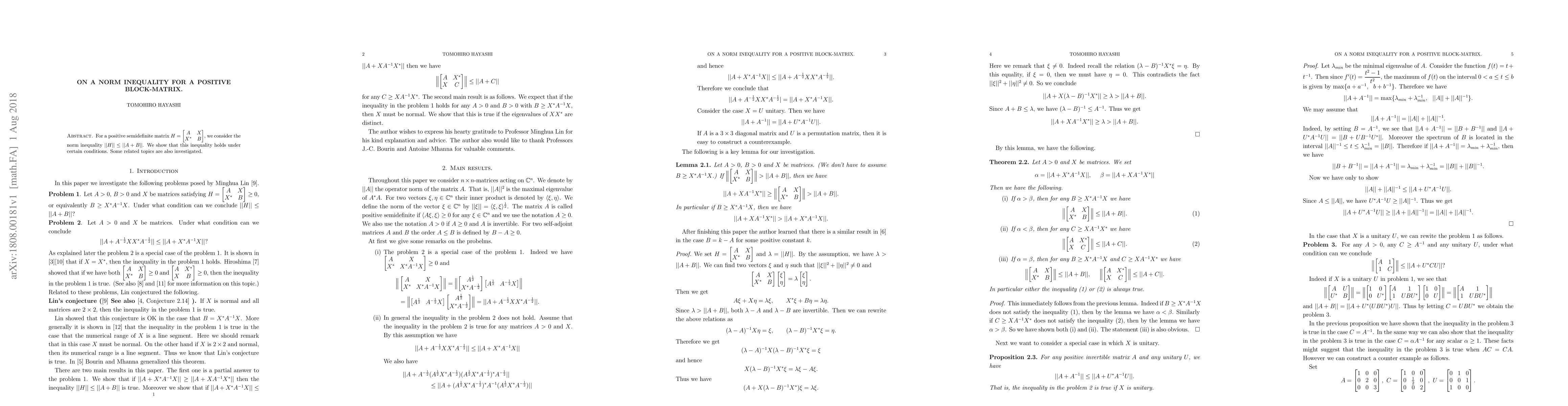 A norm inequality for a positive block-matrix is established, showing that the norm of a positive semidefinite matrix H is less than or equal to the norm of A+B under certain conditions.