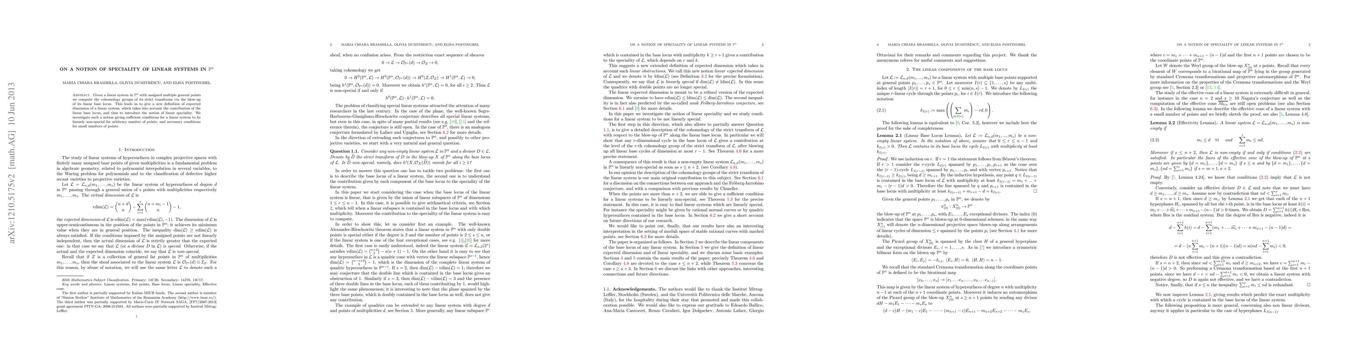 Given a linear system in P^n with assigned multiple general points we compute the cohomology groups of its strict transforms via the blow-up of its linear base locus. This leads us to give a new definition of expected dimension of a linear system, which takes into account the contribution of the linear base locus, and thus to introduce the notion of linear speciality. We investigate such a notion giving sufficient conditions for a linear system to be linearly non-special for arbitrary number of points, and necessary conditions for small numbers of points.