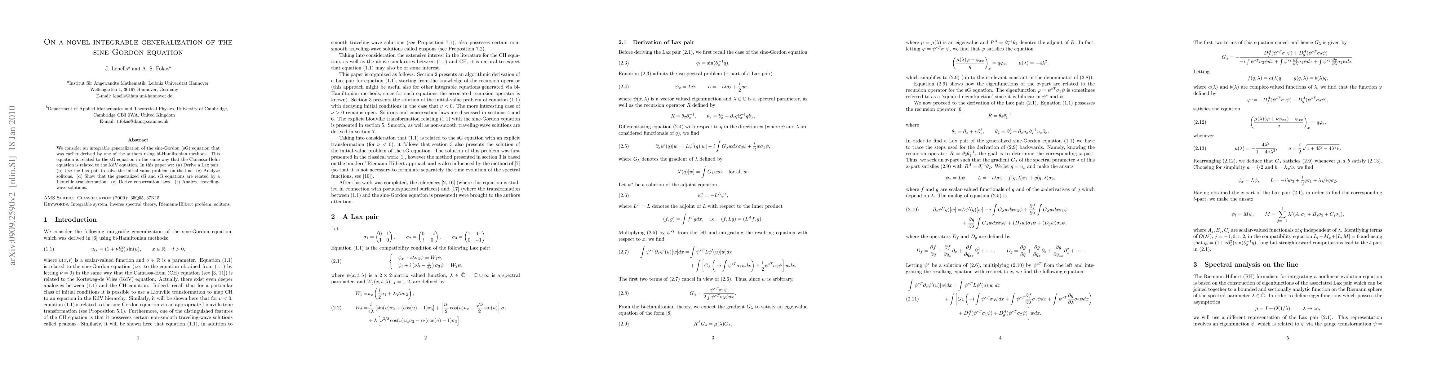 This paper presents an integrable generalization of the sine-Gordon equation, deriving a Lax pair and solving the initial value problem. It analyzes solitons, establishes a Liouville transformation linking the generalized and original sine-Gordon equations, and derives conservation laws and traveling-wave solutions.