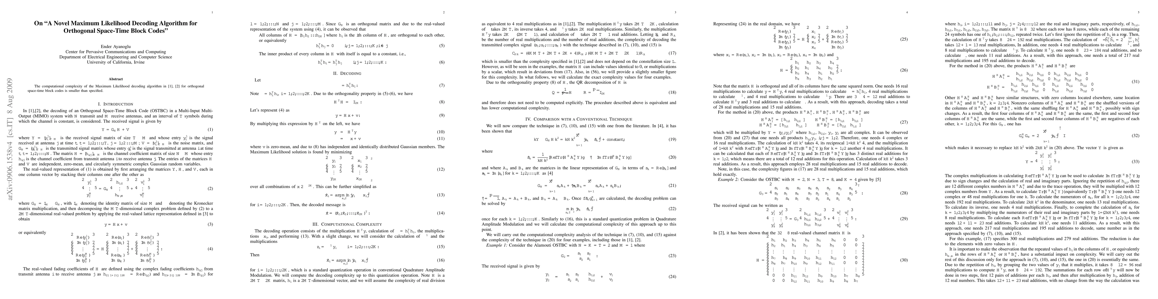 Summary: This paper proposes a novel Maximum Likelihood decoding algorithm for orthogonal space-time block codes that reduces computational complexity compared to existing methods. The new approach enhances efficiency without compromising decoding accuracy.