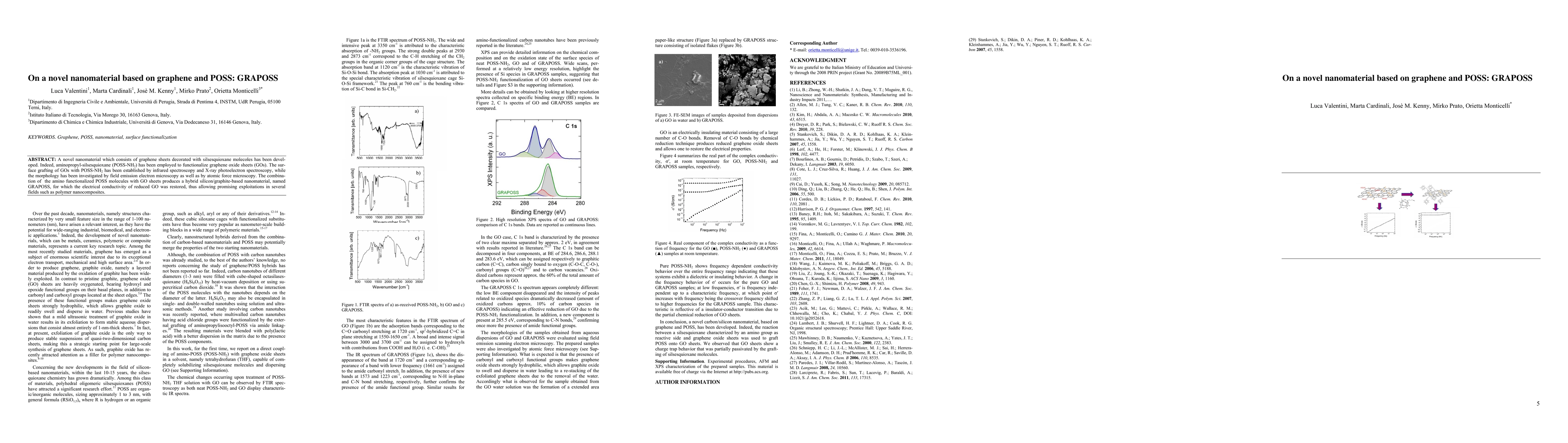 A novel hybrid nanomaterial, GRAPOSS, is developed by decorating graphene oxide sheets with aminopropyl-silsesquioxane molecules. The restored electrical conductivity of reduced GO suggests potential applications in polymer nanocomposites.
