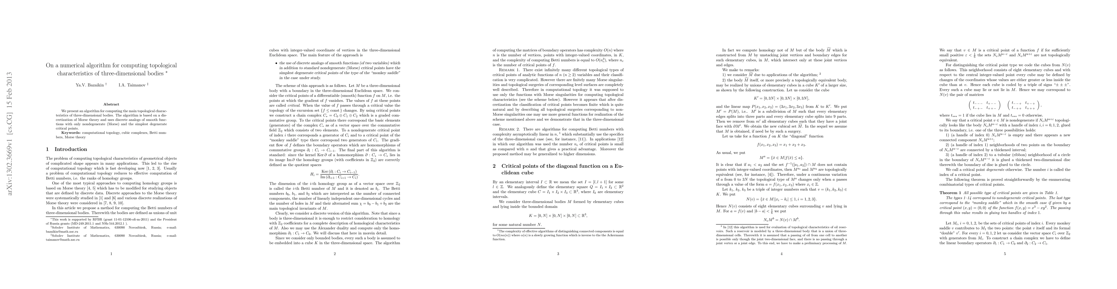 We present an algorithm for computing the main topological characteristics of three-dimensional bodies. The algorithm is based on a discretization of Morse theory and uses discrete analogs of smooth functions with only nondegenerate (Morse) and the simplest degenerate critical points.
