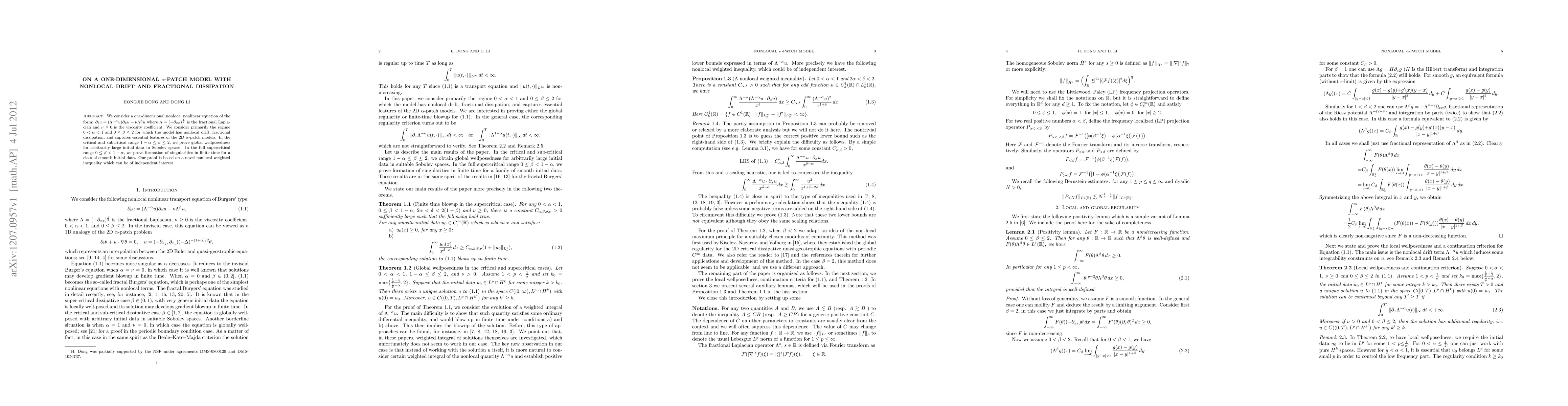 We consider a one-dimensional nonlocal nonlinear equation of the form: $\partial_t u = (\Lambda^{-\alpha} u)\partial_x u - \nu \Lambda^{\beta}u$ where $\Lambda =(-\partial_{xx})^{\frac 12}$ is the fractional Laplacian and $\nu\ge 0$ is the viscosity coefficient. We consider primarily the regime $0<\alpha<1$ and $0\le \beta \le 2$ for which the model has nonlocal drift, fractional dissipation, and captures essential features of the 2D $\alpha$-patch models. In the critical and subcritical range $1-\alpha\le \beta \le 2$, we prove global wellposedness for arbitrarily large initial data in Sobolev spaces. In the full supercritical range $0 \le \beta<1-\alpha$, we prove formation of singularities in finite time for a class of smooth initial data. Our proof is based on a novel nonlocal weighted inequality which can be of independent interest.