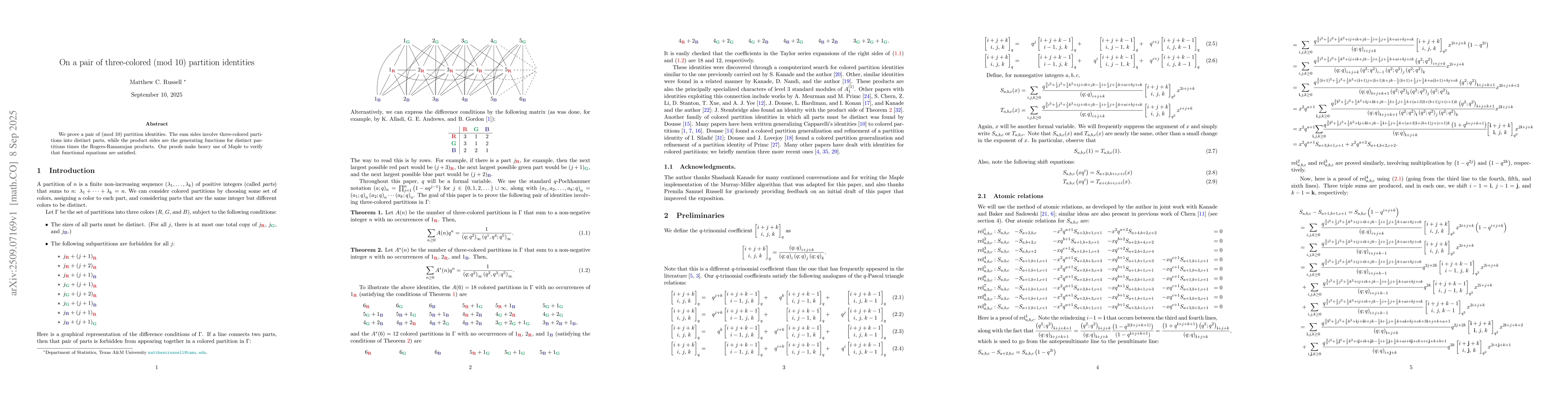 We prove a pair of (mod 10) partition identities. The sum sides involve three-colored partitions into distinct parts, while the product sides are the generating functions for distinct partitions times the Rogers-Ramanujan products. Our proofs make heavy use of Maple to verify that functional equations are satisfied.