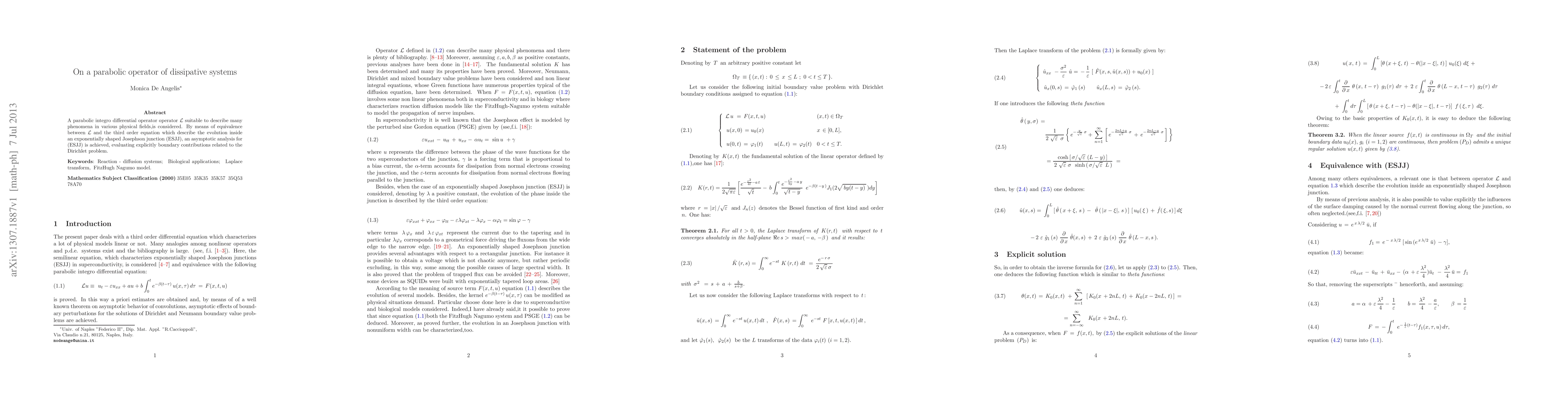 A parabolic integro differential operator operator L suitable to describe many phenomena in various physical fields,is considered. By means of equivalence between L and the third order equation which describe the evolution inside an exponentially shaped Josephson junction (ESJJ), an asymptotic analysis for (ESJJ) is achieved, evaluating explicitly boundary contributions related to the Dirichlet problem.